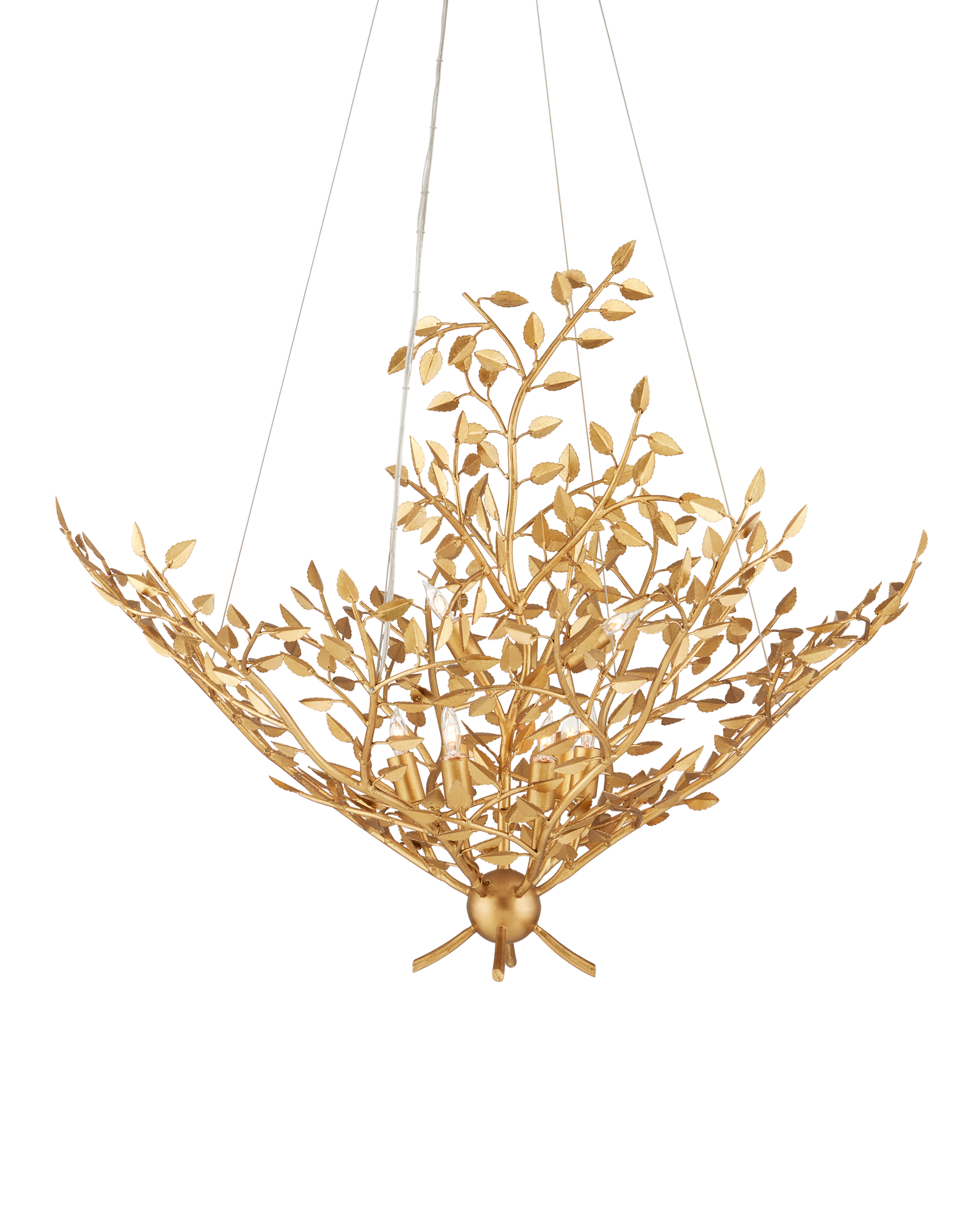 Aviva Stanoff designed the Huckleberry Chandelier with its leaves welded on forged metal twigs, carefully handcrafted then finished in contemporary gold leaf. Stanoff says of her inspiration for the six-light chandelier, "Traced back to Arthurian Lore, it is said huckleberry garlands were given to knights of the kingdom for coming to the service of a damsel. They would approach the ladies, lower their lances, and give the small branches as symbols of gratitude; much like medals. I love that: the romance of ancient lore is a beautiful thing to honor." Adjustable from 40.5" to 160.5" with use of included chain/rod kit/cable. If your space calls for a longer drop, additional chain/rods/cable is available for purchase.