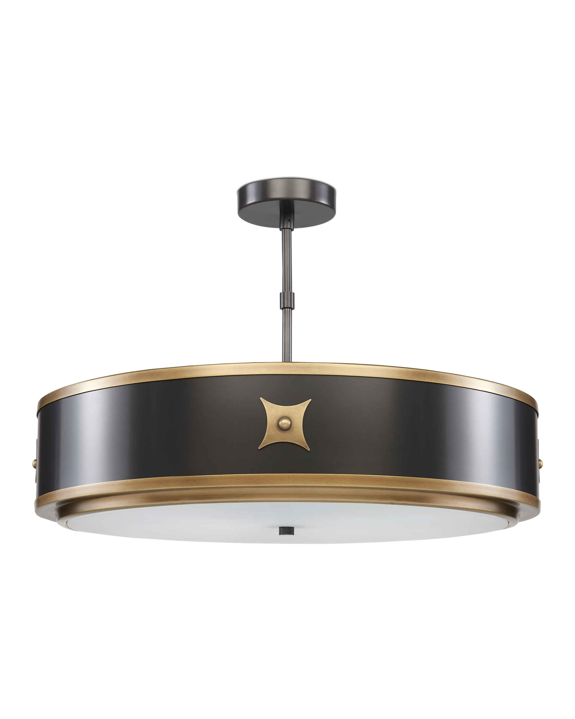 Design notes that make the Huntsman Pendant special include the narrow drum shape of the shade, the satin black and contrasting antique brass finishes, the lines of gold on the exterior of the shade, and the decorative medallions adorning the black pendant.