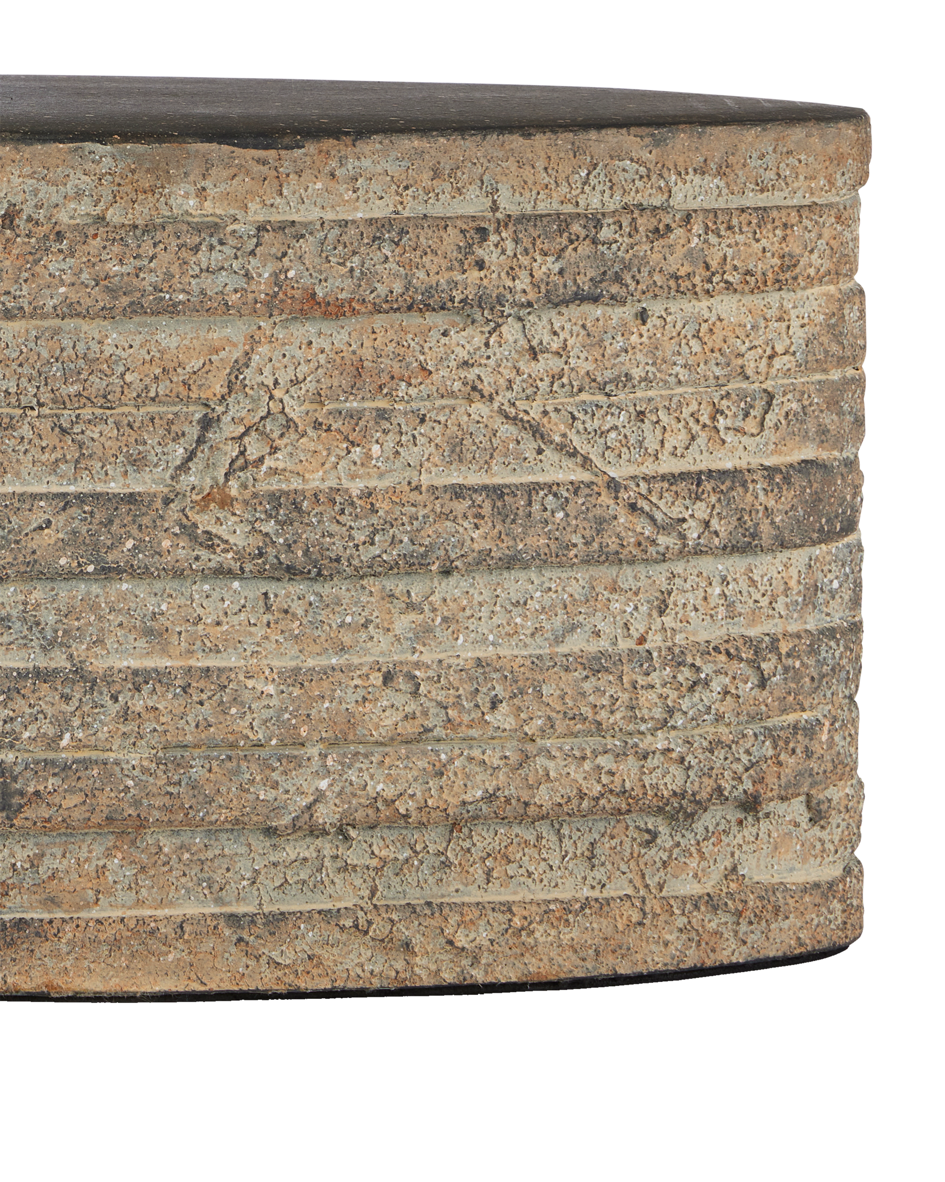 Flat discs of terracotta encircle a wrought iron spine on our Innkeeper Oval Table Lamp. The rustic feel of this natural material means it has subtle variations in color and texture that have been enhanced with a rustic granite finish. The gray table lamp is topped with a vanilla linen shade held in place by a matching terracotta finial. The scale of the elliptical shade is perfectly balanced with the smaller terracotta oval of its body.