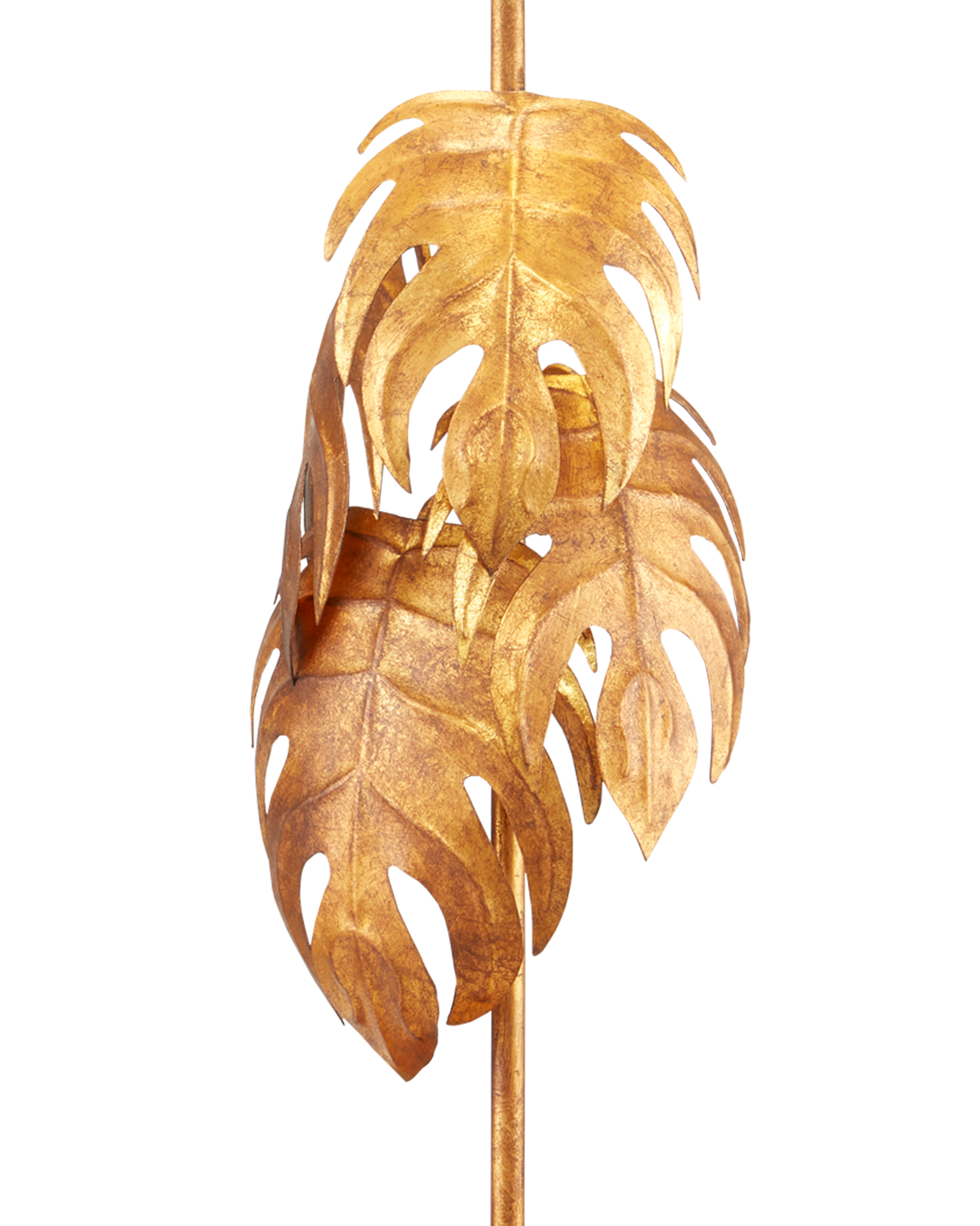The Irving Table Lamp is made of wrought iron in a golden vintage finish for a seriously luxurious glow. The gold table lamp was inspired by oversized monstera leaves, a plant in the philodendron family. The leaves are made of laser-cut metal that was wrapped over a wooden mold to form them. The artful lamp is as much a sculpture as it is a light fixture.