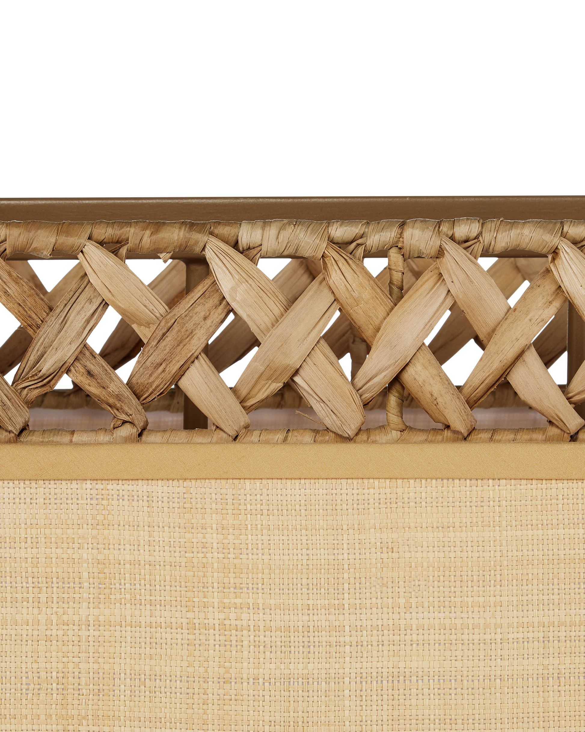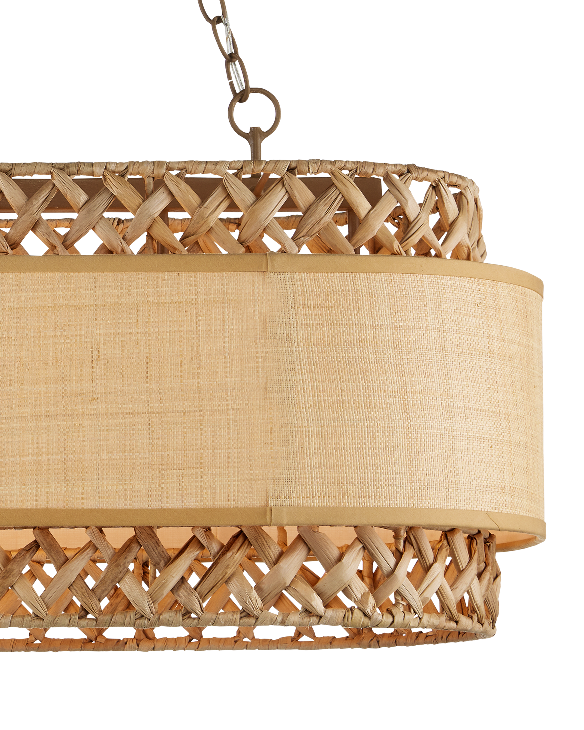 The natural material story continues with the Isola Chandelier with its wrought iron frame in a khaki finish and mix of natural water hyacinth and grasscloth fabric. Designed by Clarence Mallari, the smaller, taller oval that encircles the light has a rough luxe weave of the water hyacinth; while the wider, shorter oval has a tighter weave that juxtaposes the looser crosshatching on this tan chandelier. A design detail of note is that the seams match up when the outer shade transitions from straight to curved. Adjustable from 34" to 100" with use of included chain/rod kit/cable. If your space calls for a longer drop, additional chain/rods/cable is available for purchase.