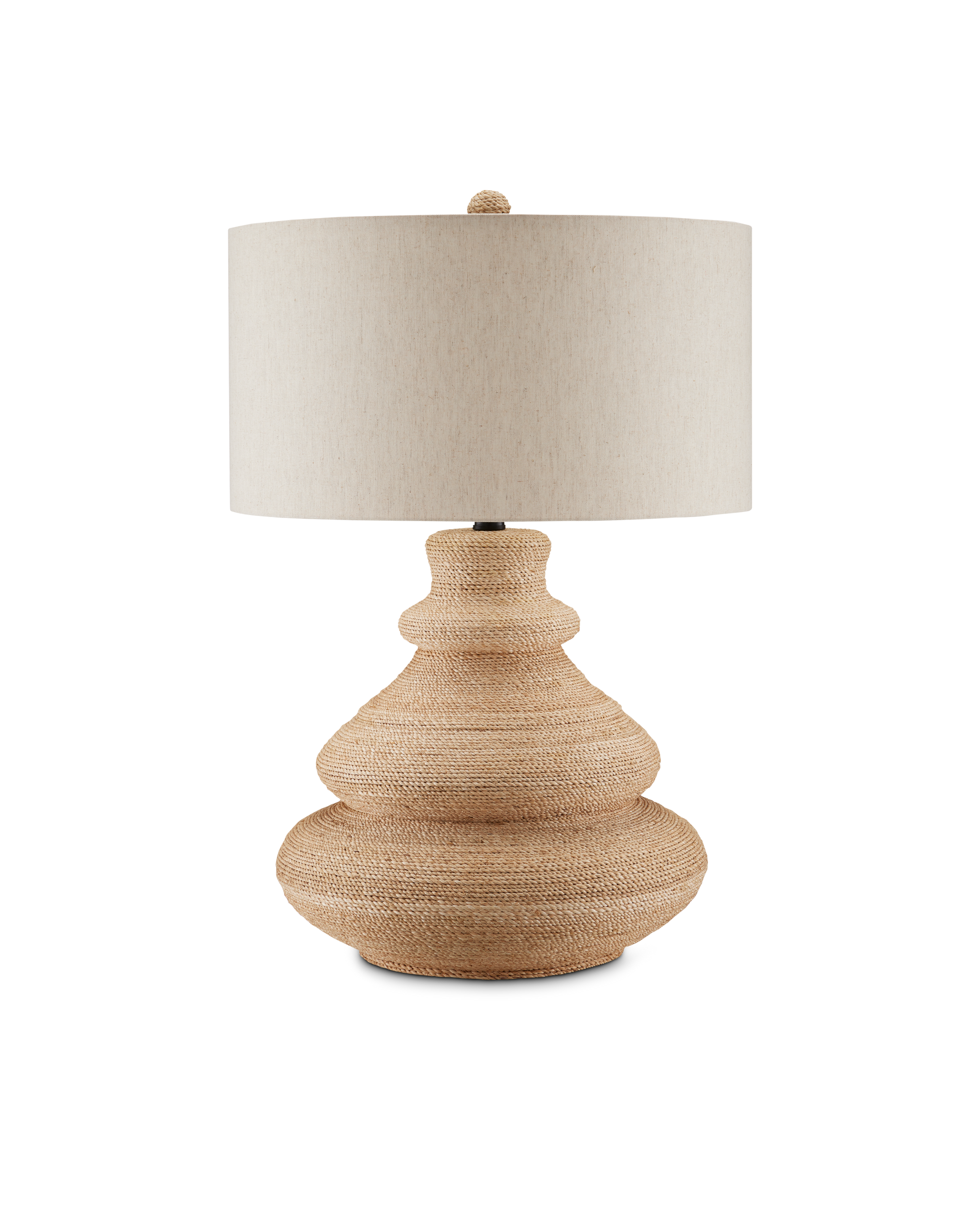 The Jaru Table Lamp has a body made of cascading rounded shapes that are seamlessly wrapped in natural rope, a painstaking process that takes arisans many hours to achieve. A design detail that illustrates finesse is the orb finial, also wrapped in rope, that fastens the natural linen shade to the tan lamp.