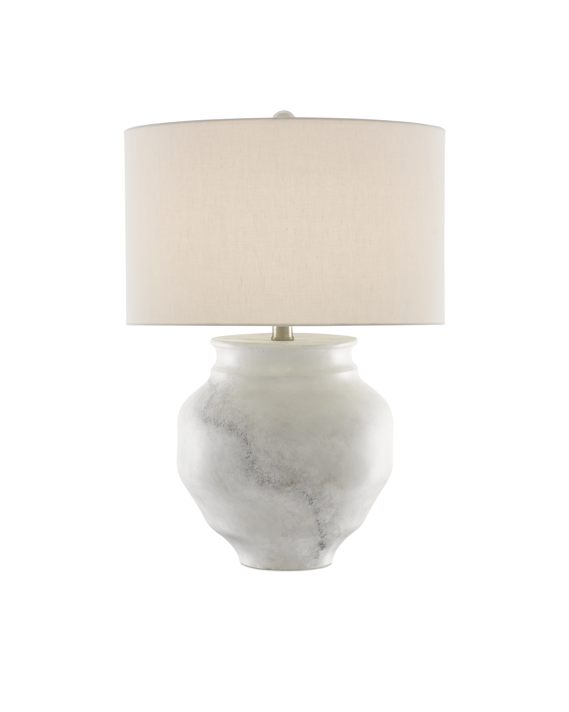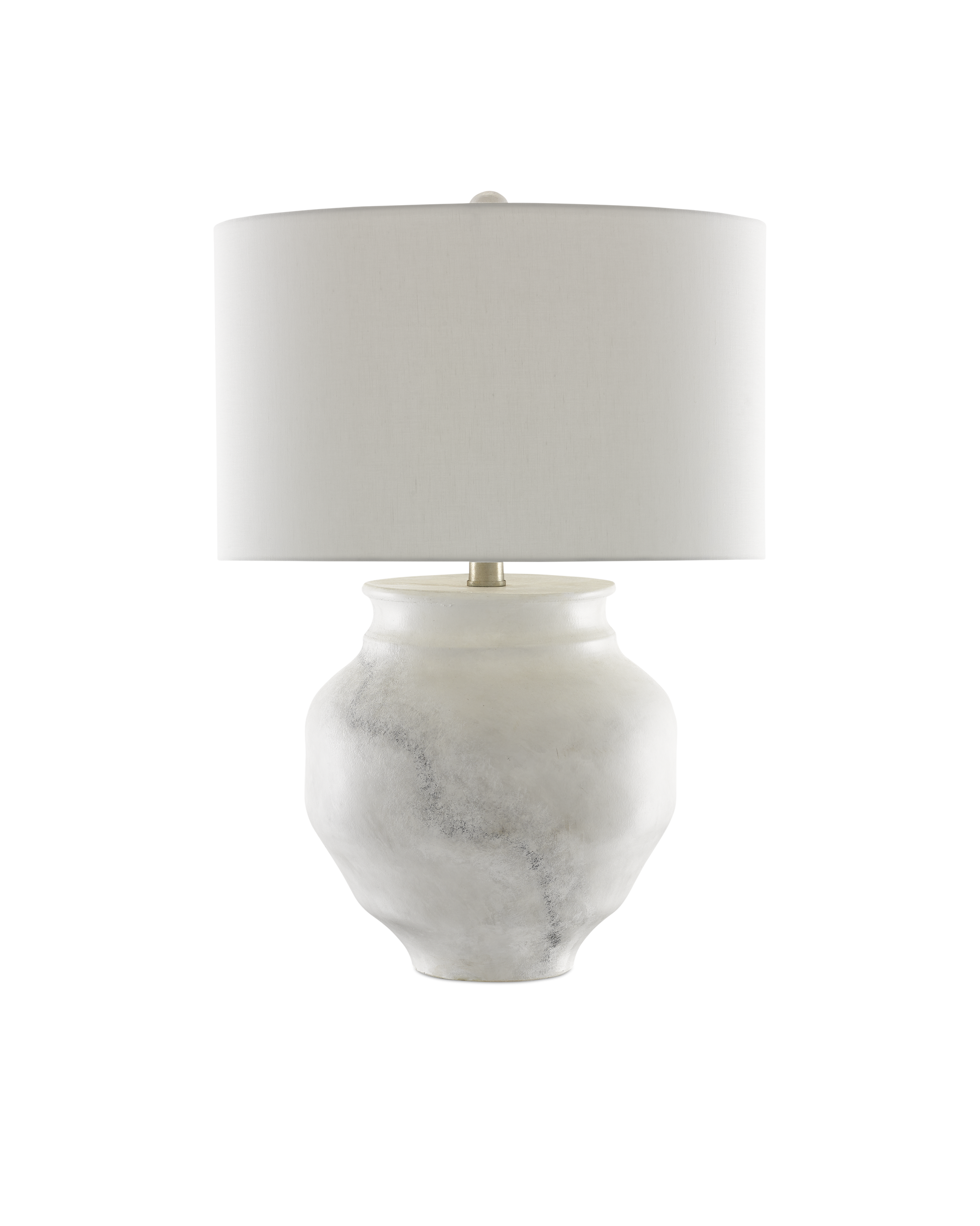 The Kalossi Table Lamp has a surface with a marble-like feel, though it is made of terracotta. The subtle patterning on the white lamp has been painstakingly applied by our artisans. The Kalossi is topped with an off-white shantung shade.