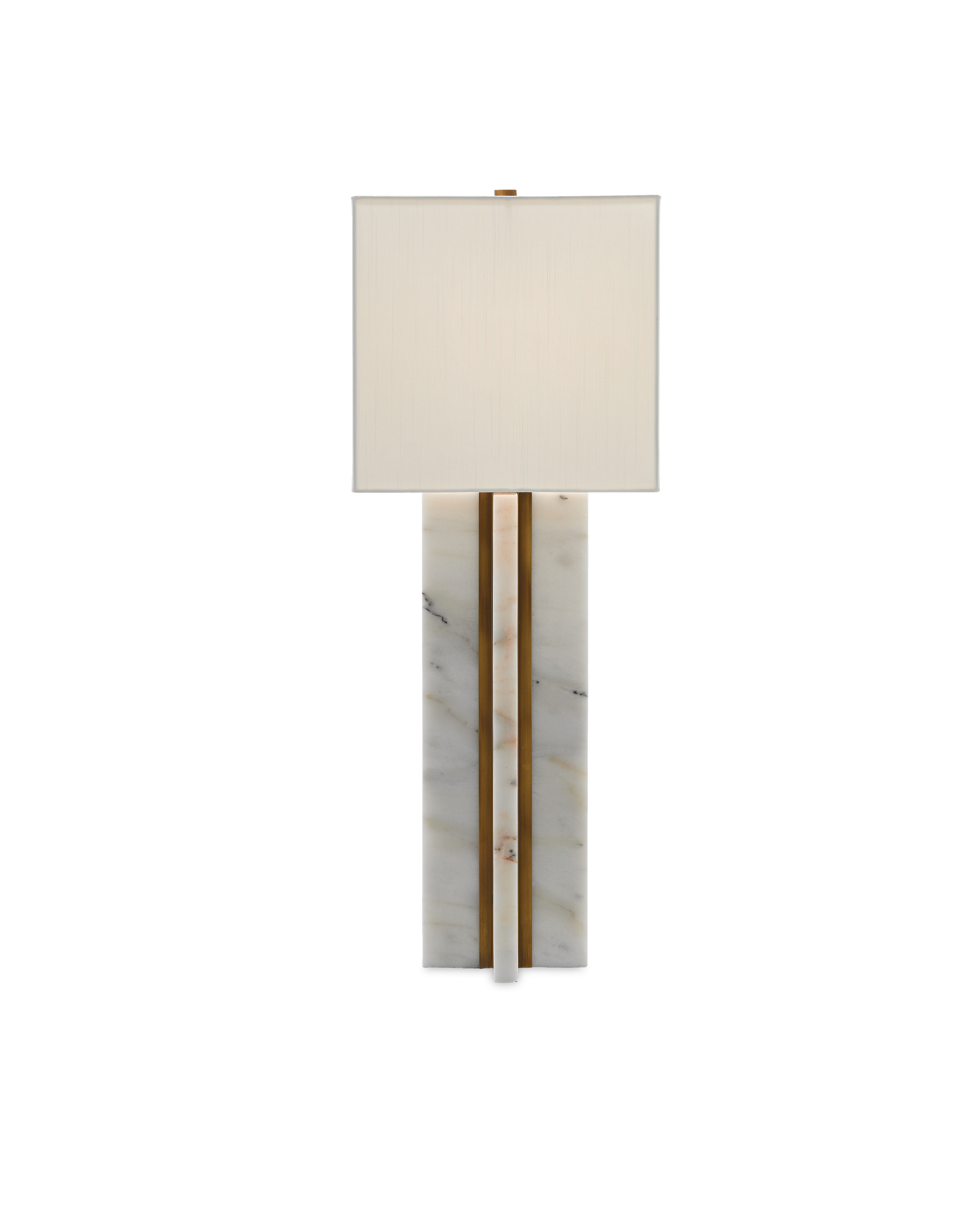 Slabs of marble intersected by metal in an antique brass finish have never looked so modern as they do in the Khalil Table Lamp. The patinated metal brings out the salmon-colored tones and the rectangular off-white shantung shade adds to the smartness of this marble lamp.