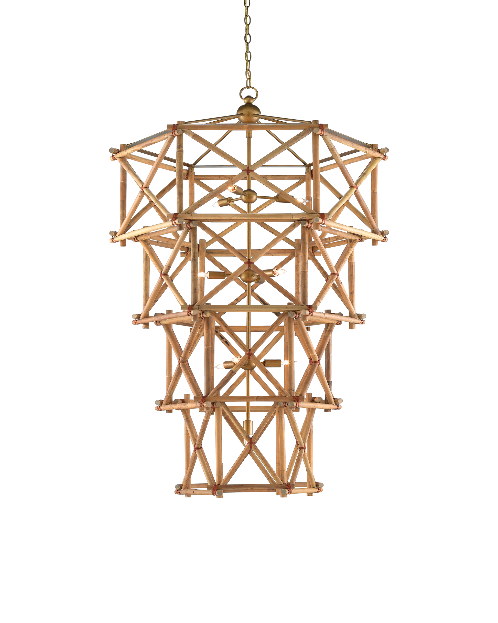 Our Kingali Grande Chandelier has interlocking sections of natural Rattan fastened by wrought iron ties in a new brass finish, designed by Clarence Mallari. Adjustable from 64.25" to 130.75" with use of included chain/rod kit/cable. If your space calls for a longer drop, additional chain/rods/cable is available for purchase.