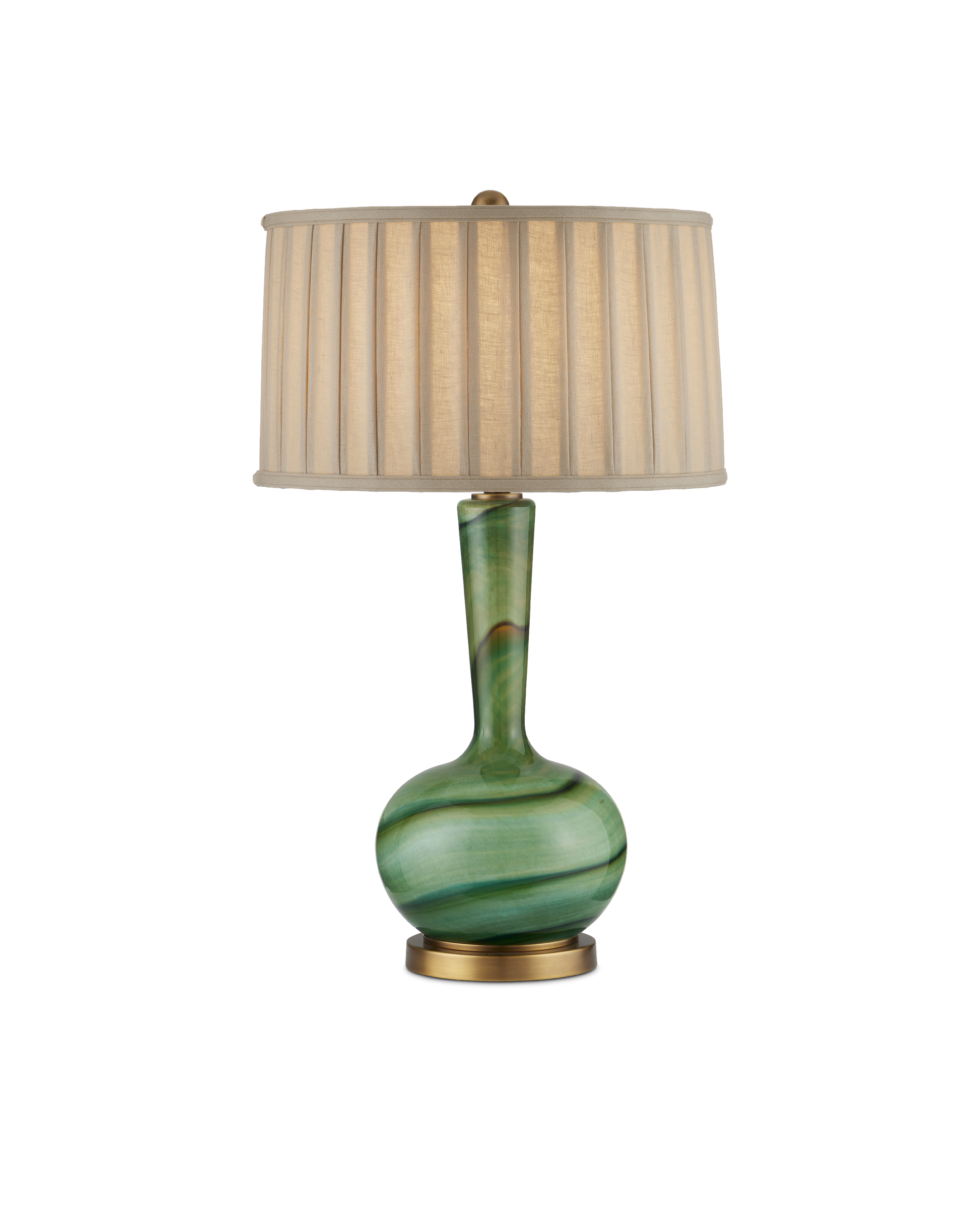 With mid-century modern lines, the Lamartine Table Lamp has a poetic pattern that swirls along its surface. Made of glass in differing shades of green, the lamp was created in such a way that the pattern will vary slightly from piece to piece. Complemented with metal in an antique brass finish, the richness of the overall palette makes it a luminous accessory in a space. The green lamp is topped with a box-pleated drum shade.
