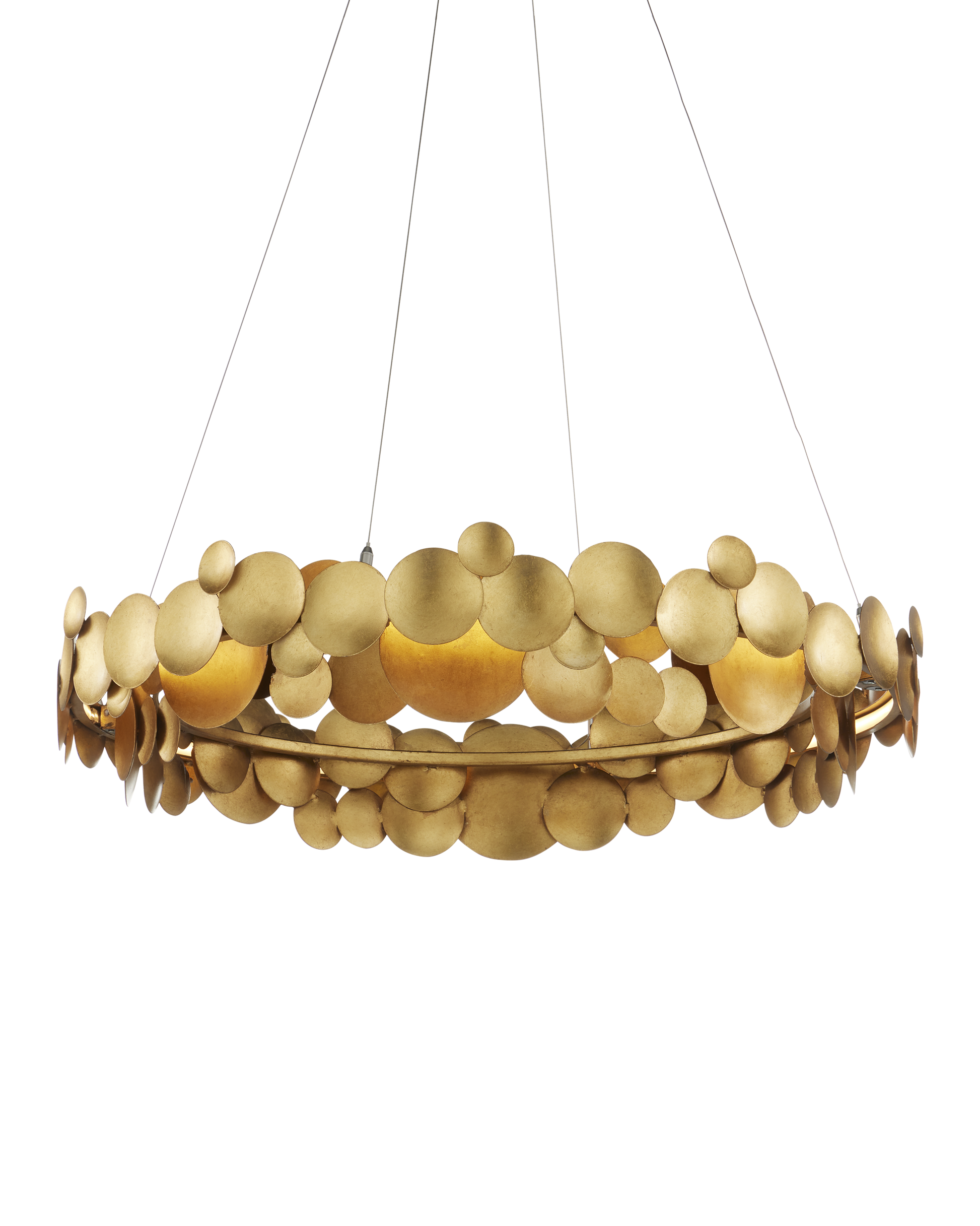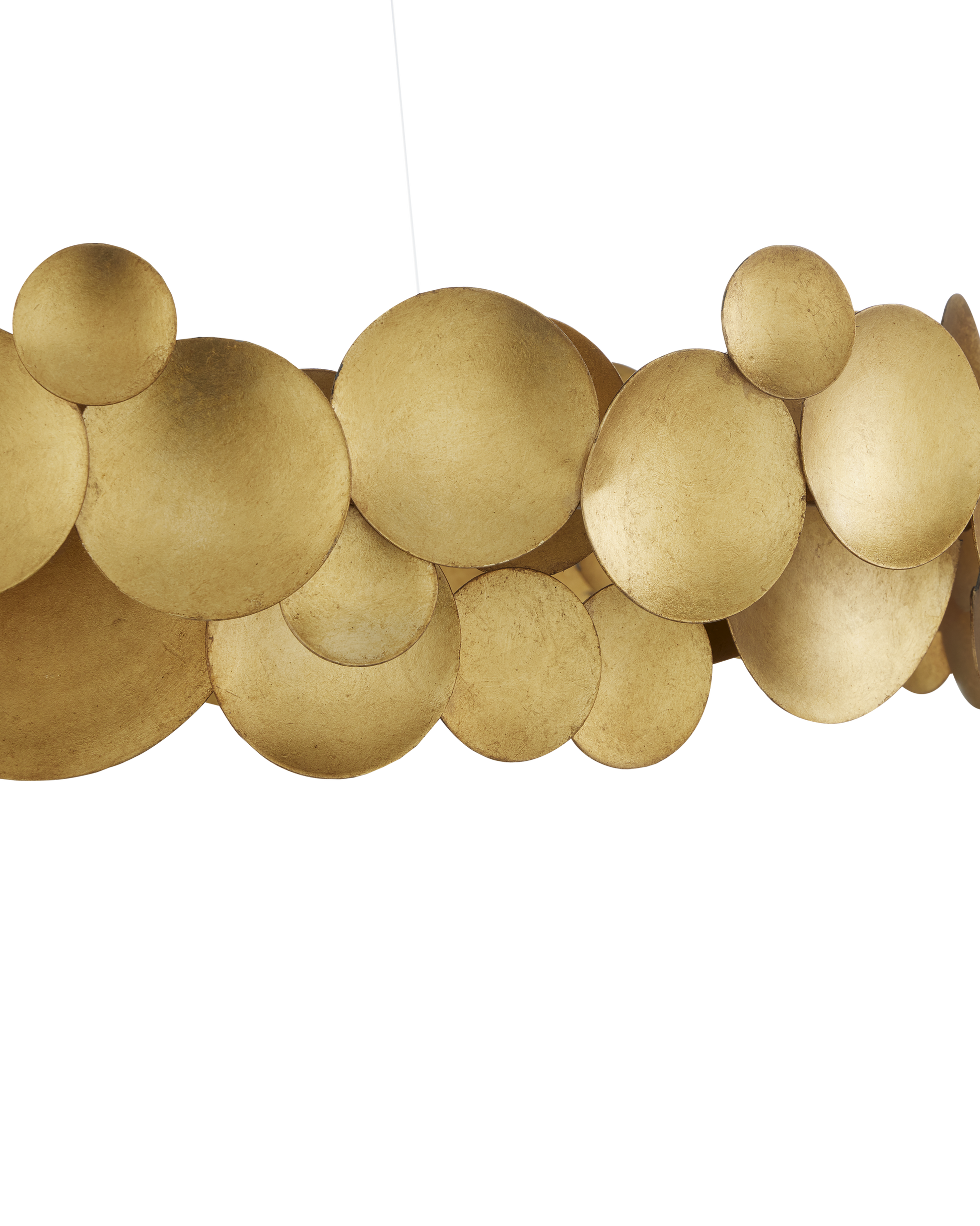 The Lavengro Chandelier is a layered design with a tremendous amount of charm. Wrought-iron discs in varying sizes are stacked in meandering patterns to make up the shade. The contemporary gold leaf finish on the discs and the central bar to which these are fastened gleam warmly whether the lights are switched on or not. This modern design by Clarence Mallari is innovative, as well, as it is lit by integrated LED technology. Adjustable from 31" to 124" with use of included chain/rod kit/cable. If your space calls for a longer drop, additional chain/rods/cable is available for purchase.