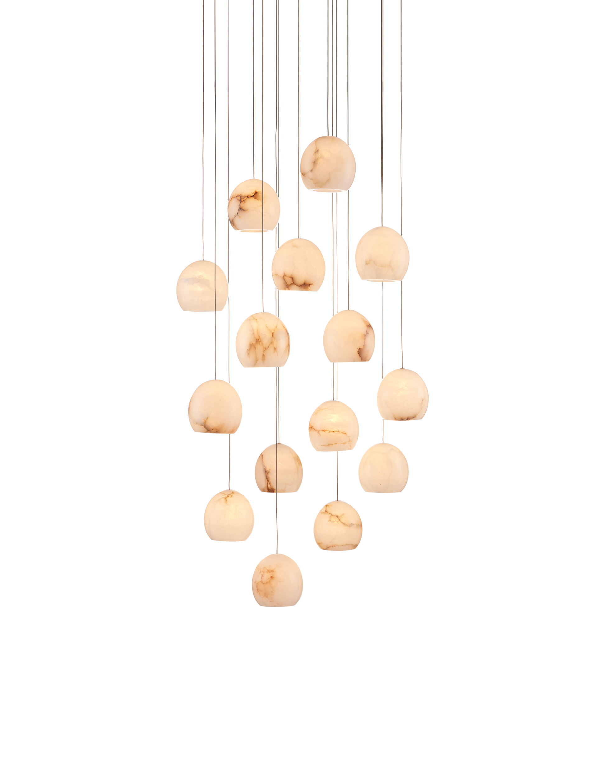 The Lazio Round 15-Light Multi-Drop Pendant has luminous shades carved from natural alabaster. The veining in the material makes each shade unique because each stone taken from the earth will have its own personality. The canopy of this piece is luminous in a painted silver finish. This fixture is among Currey & Company's multi-drop pendant collection, which includes multiple configurations.
