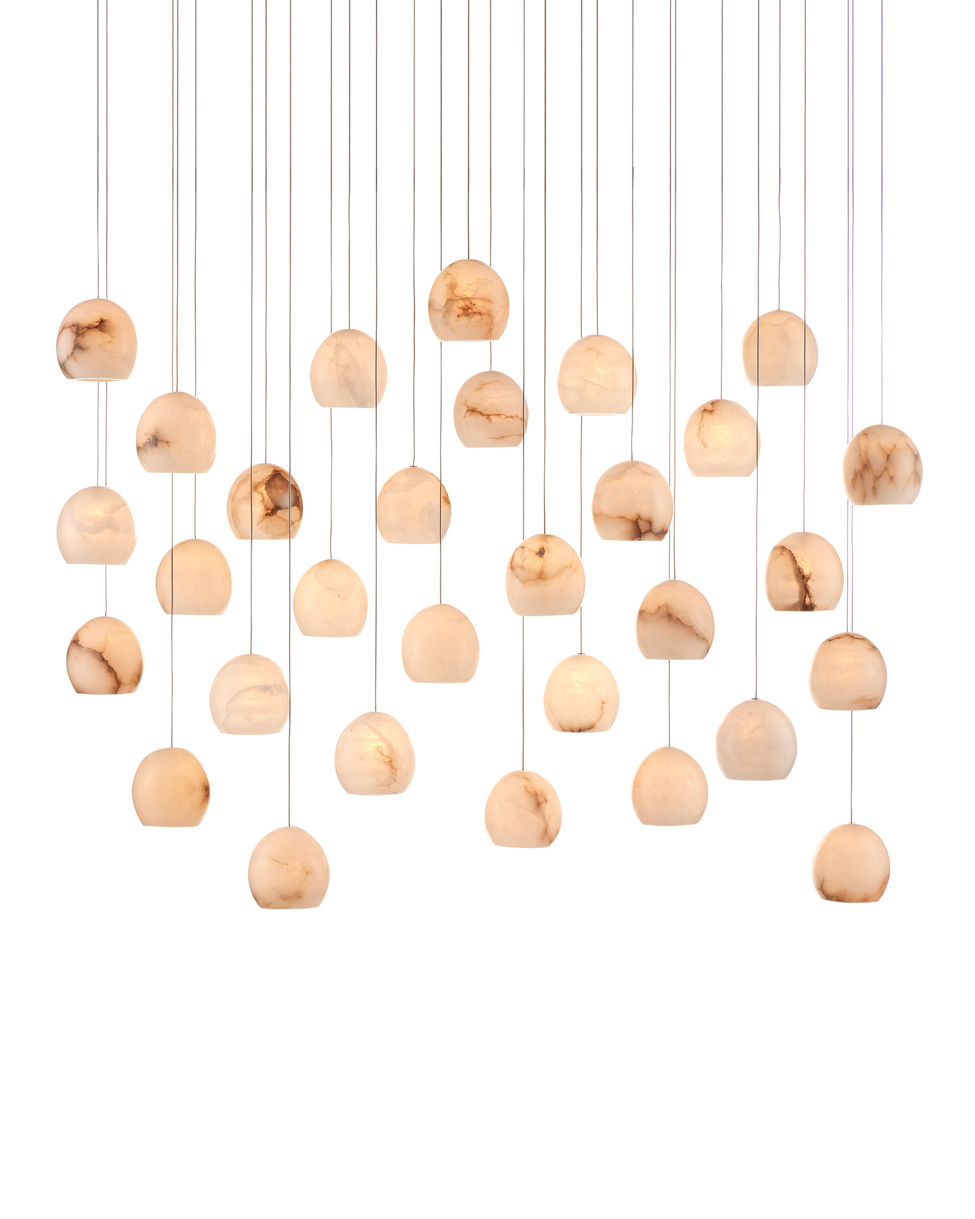 The Lazio 30-Light Multi-Drop Pendant has luminous shades carved from natural alabaster. The veining in the material makes each shade unique because each stone taken from the earth will have its own personality. The canopy of this piece is luminous in a painted silver finish. This fixture is among Currey & Company's multi-drop pendant collection, which includes multiple configurations.