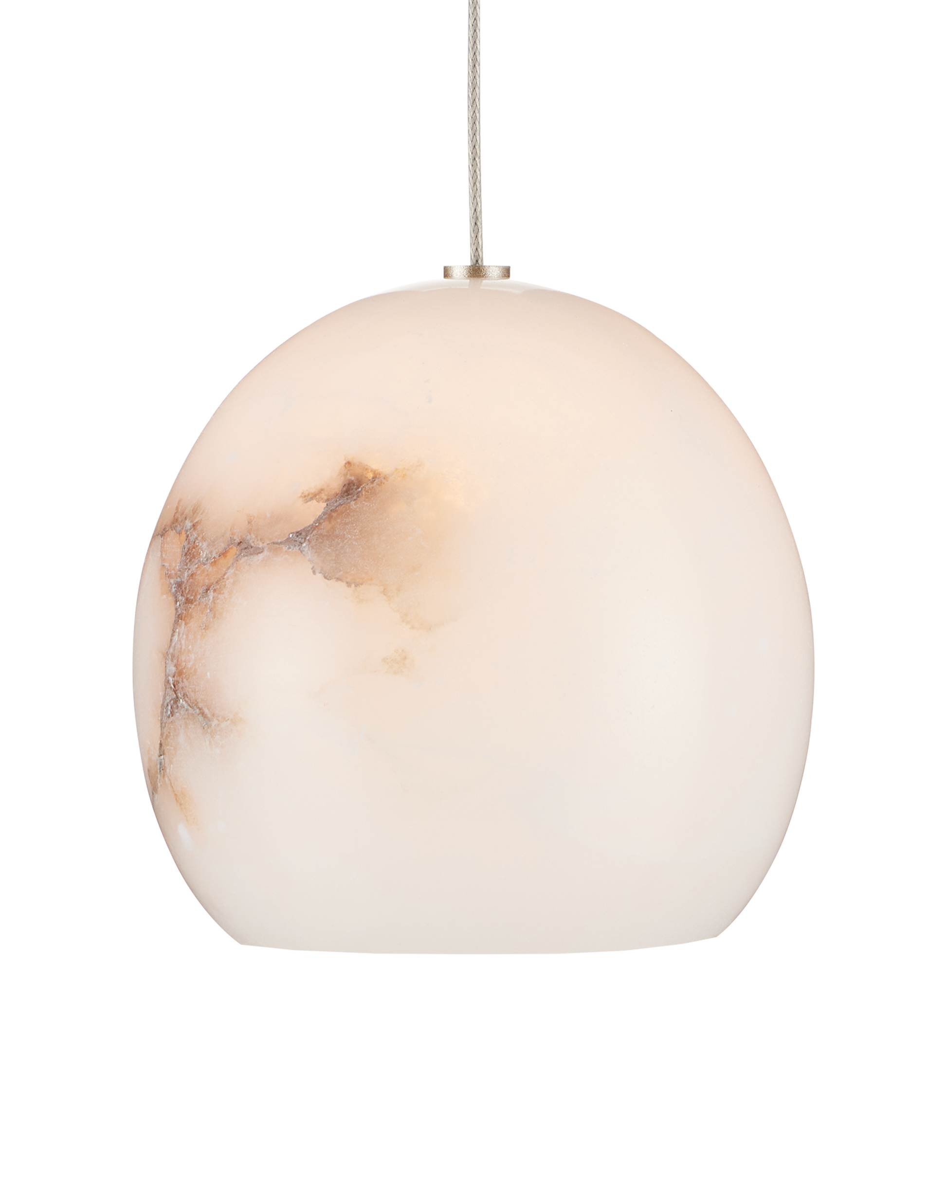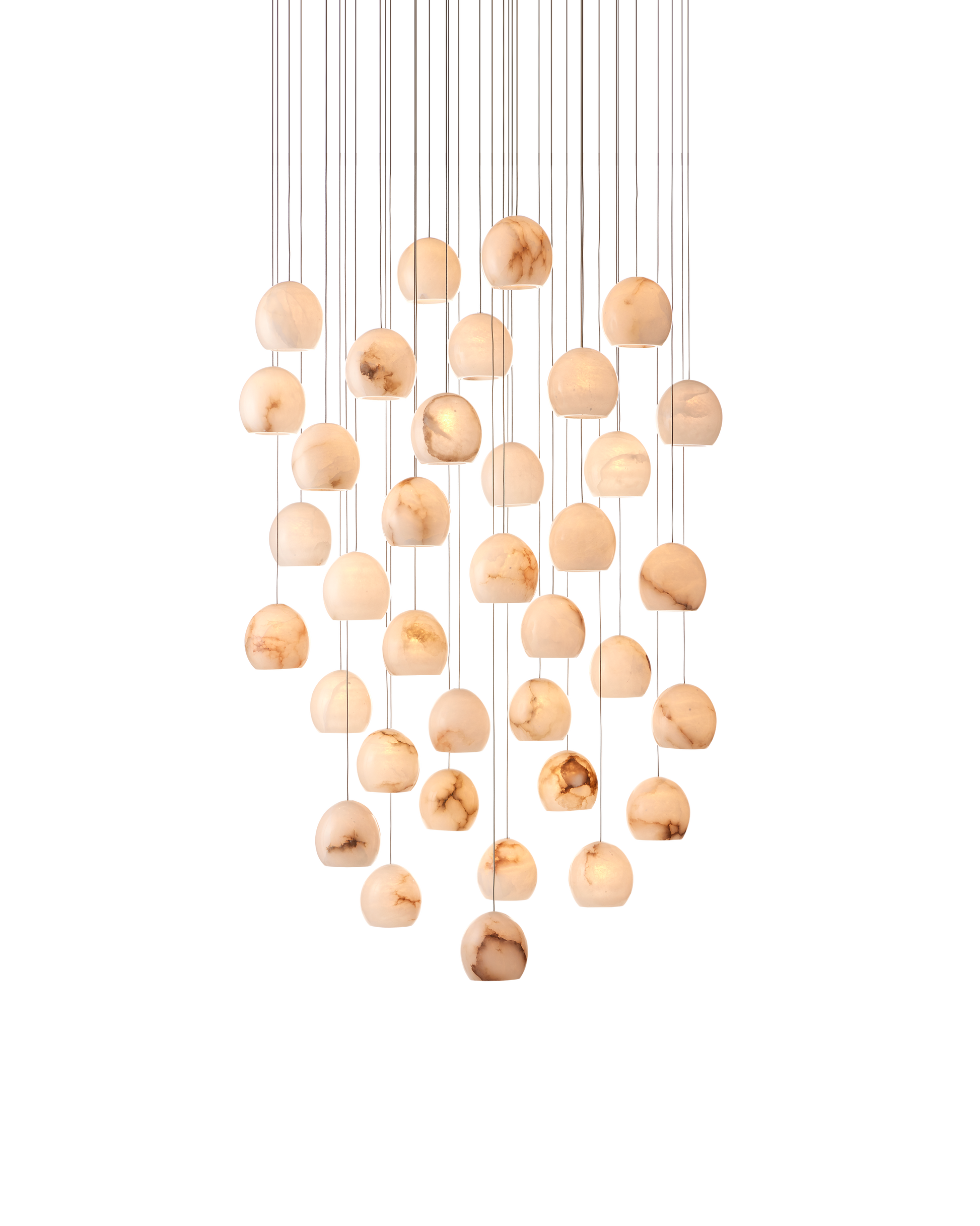 The Lazio 36-Light Multi-Drop Pendant has luminous shades carved from natural alabaster. The veining in the material makes each shade unique because each stone taken from the earth will have its own personality. The canopy of this piece is luminous in a painted silver finish. This fixture is among Currey & Company's multi-drop pendant collection, which includes multiple configurations.