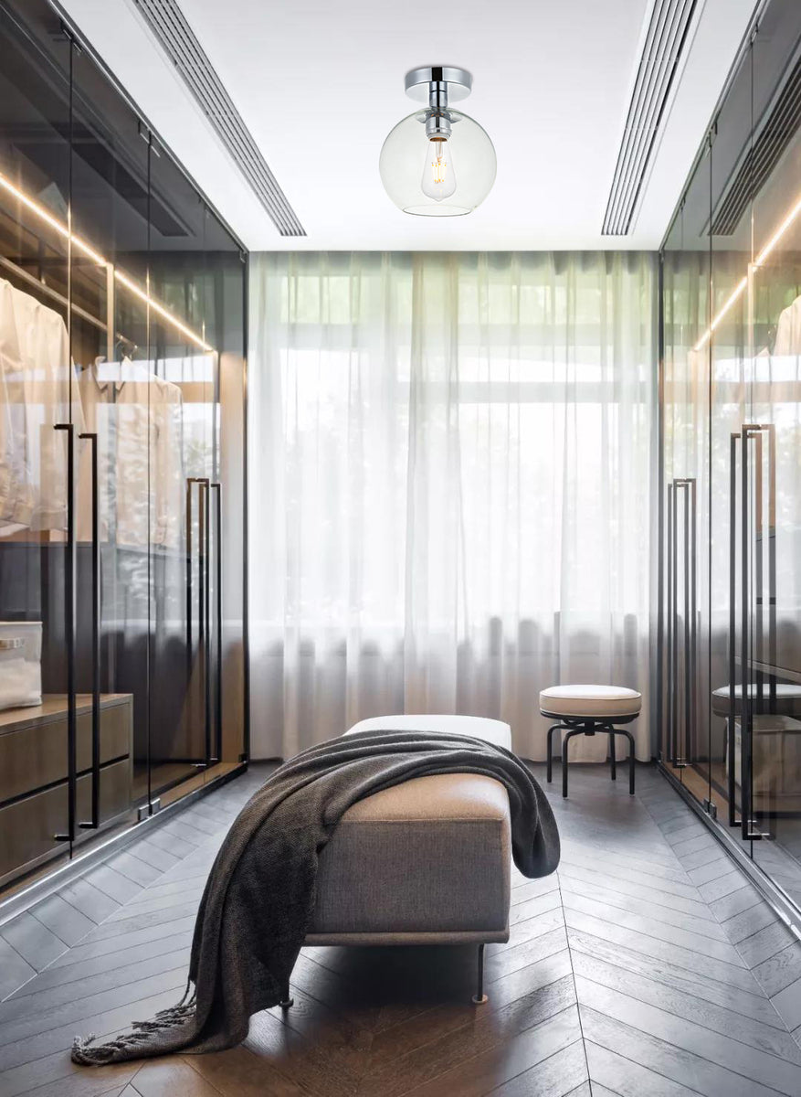 Refined style with a practical design, Baxter flush-mount ceiling lamps bring cosmopolitan sophistication anywhere, especially to an entryway, hallway, bathroom, kitchen, or closet. The smooth iron frame features a disk-shaped canopy and comes in a chrome finish. The spherical clear-glass shade remains open at the center to allow for effortless replacement of the filament-style bulb (not included). Living in the big city has never been this easy.