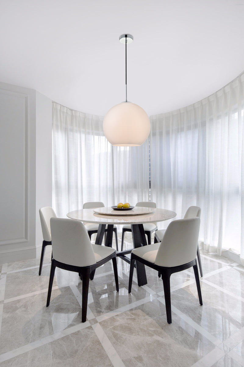 Refined style with a practical design, Baxter hanging pendant lamps bring cosmopolitan sophistication anywhere, especially to an entryway, office, bathroom, bedroom, or kitchen. The smooth iron frame features a disk-shaped canopy and comes in a chrome finish. An adjustable black cord allows you to vary the hanging height from 20 to 73 inches. The frosted white spherical glass shade remains open at the center to allow for effortless replacement of the filament-style bulb (not included). Living in the big city has never been this easy.