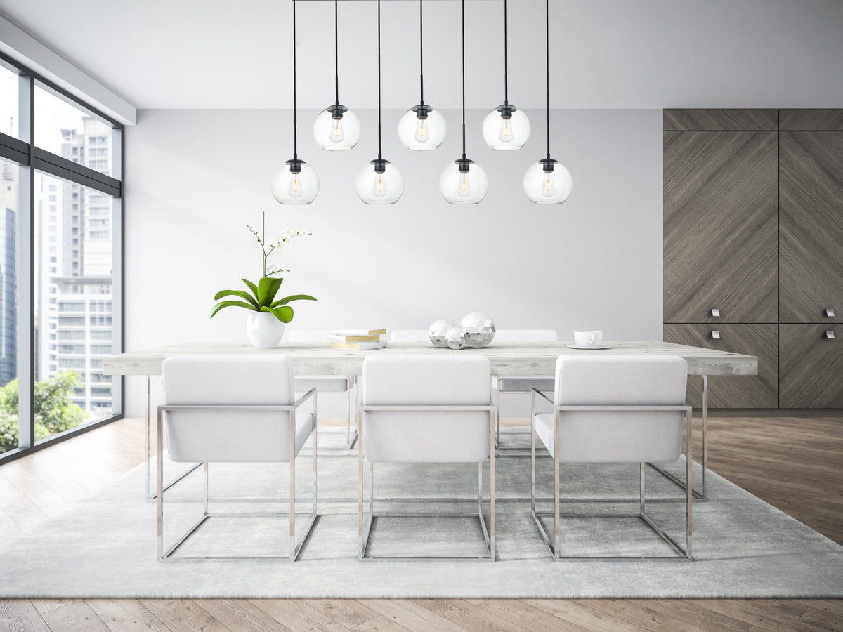 Refined style with a practical design, Baxter hanging pendant lamps bring cosmopolitan sophistication anywhere, especially to an entryway, office, bathroom, bedroom, or kitchen. The smooth iron frame features a rectangular canopy and comes in a black finish. Adjustable black cords allow you to vary the hanging height from 14 to 87 inches. Two staggered rows of seven identical clear spherical glass shades remain open at the center to allow for effortless replacement of the filament-style bulbs (not included). Living in the big city has never been this easy.
