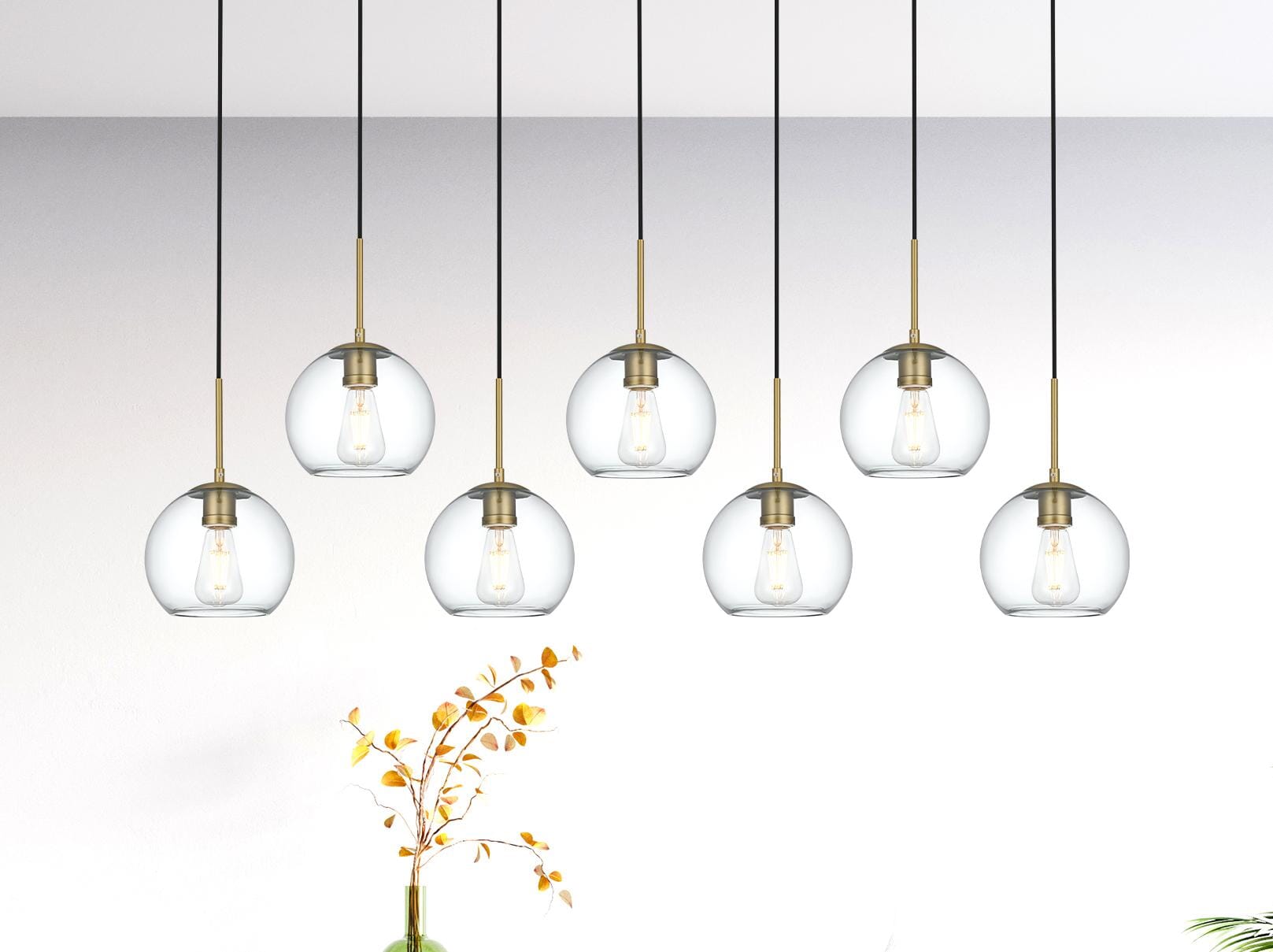 The Baxter hanging pendant light combines refined style with a practical design, adding cosmopolitan sophistication to any space—be it an entryway, hallway, bathroom, kitchen, or closet. The sleek iron frame, complete with a rectangular canopy, elegantly supports seven clear spherical glass shade that stays open at the center, making bulb replacement effortless. Designed for those who love the look of big-city elegance, the Baxter pendant makes sophisticated living easy.