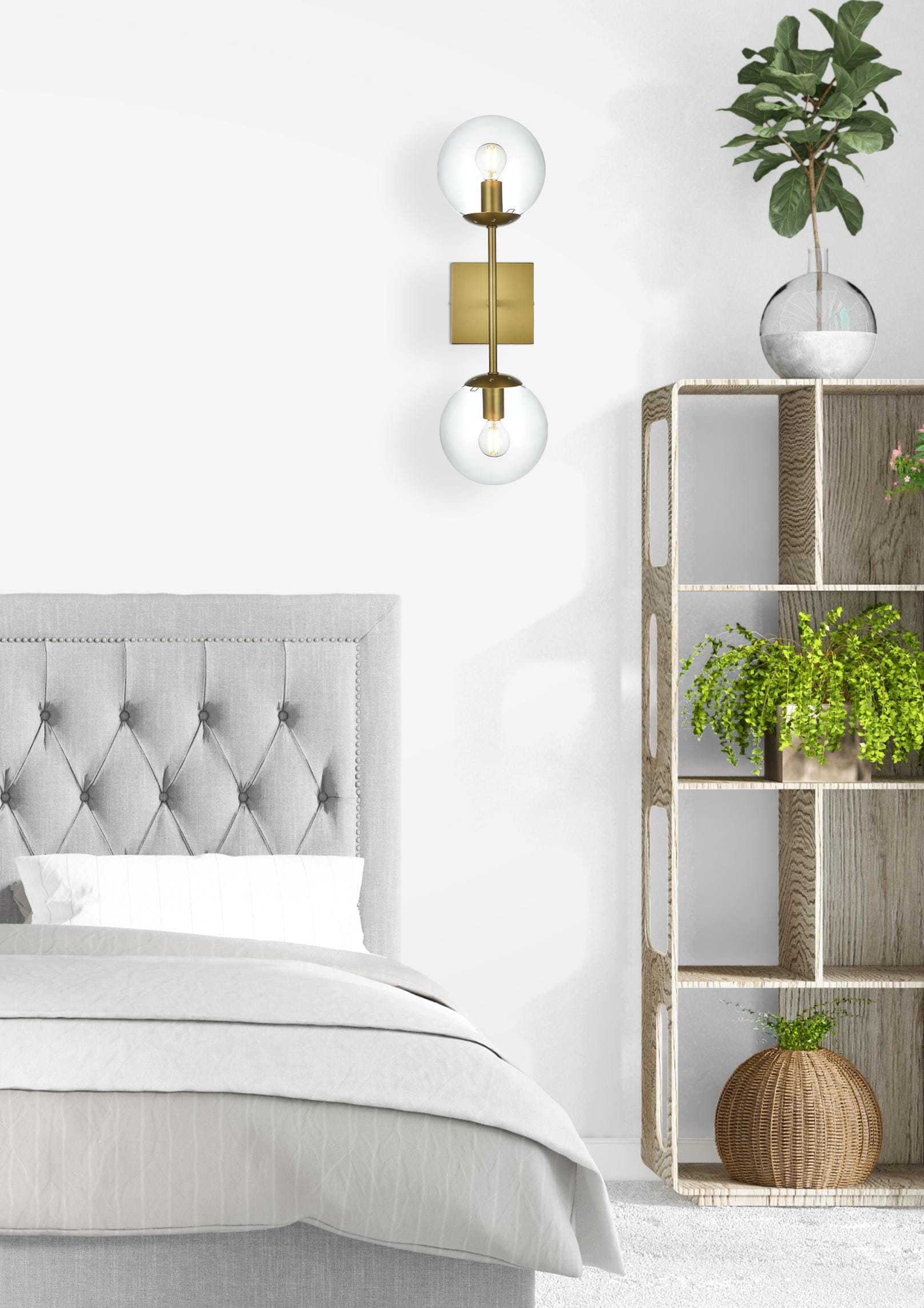 The Neri Collection wall sconce is a distinctive light that will pop in your room. The globe shade and sleek straight arm creates a clean form. The two bulbs allow themselves to brighten up the room in both directions. Available in a satin gold, chrome, black and/or brass finish, and a clear shade, let this wall lamp illuminate your room. You can choose whether to have one or two lights. This product is dimmable and requires one or two E12 lamps. Light bulbs not included.