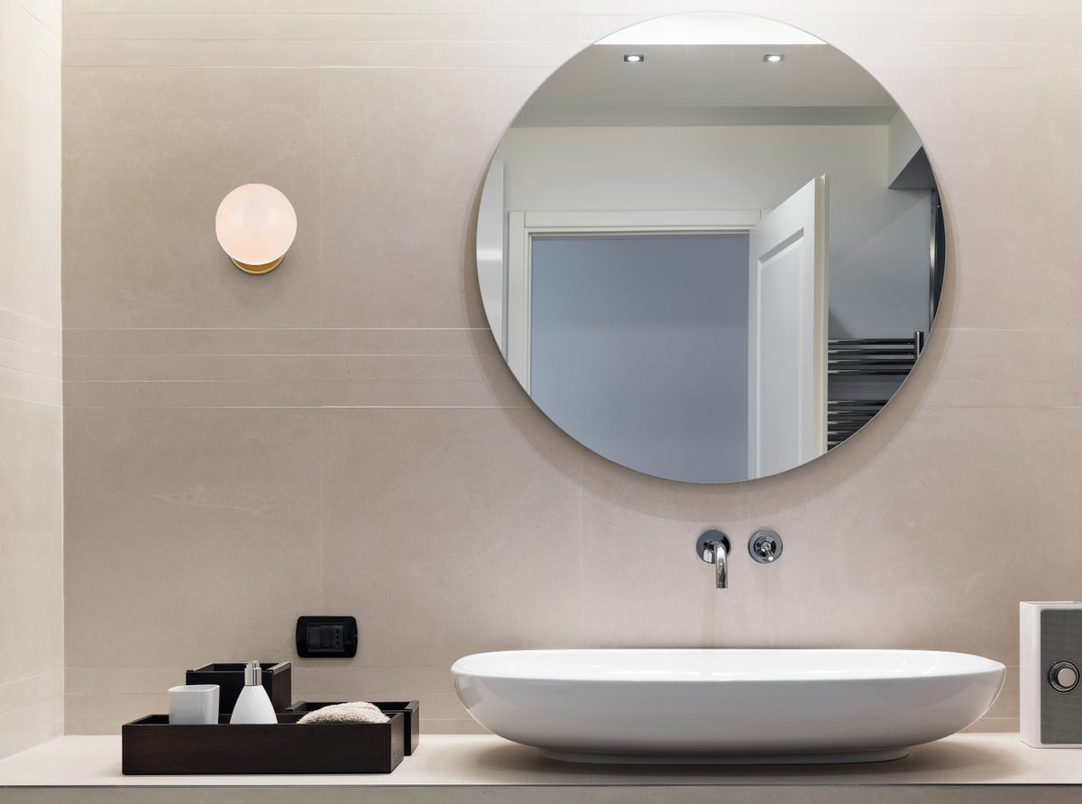 Refined style with a practical design, Mimi flush-mount or bath sconce bring cosmopolitan sophistication anywhere, especially to an entryway, hallway, bathroom, kitchen, or closet. The smooth iron frame features a disk-shaped canopy. The frosted spherical glass shade houses one medium socket lamp, bulb is not provided.