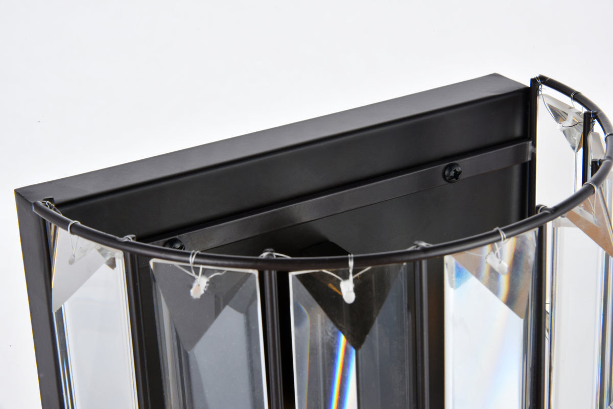 The Blair collection brings magnificent contemporary elegance to your hallway, study, or media room. This sconce is set in a cylindrical, Iron frame with an oil-rubbed bronze finish. The open, cage-like design forms three rows of rectangular spaces adorned with large, clear royal-cut baguette Crystals that gracefully refract light while drawing the eye to their organic beauty.
