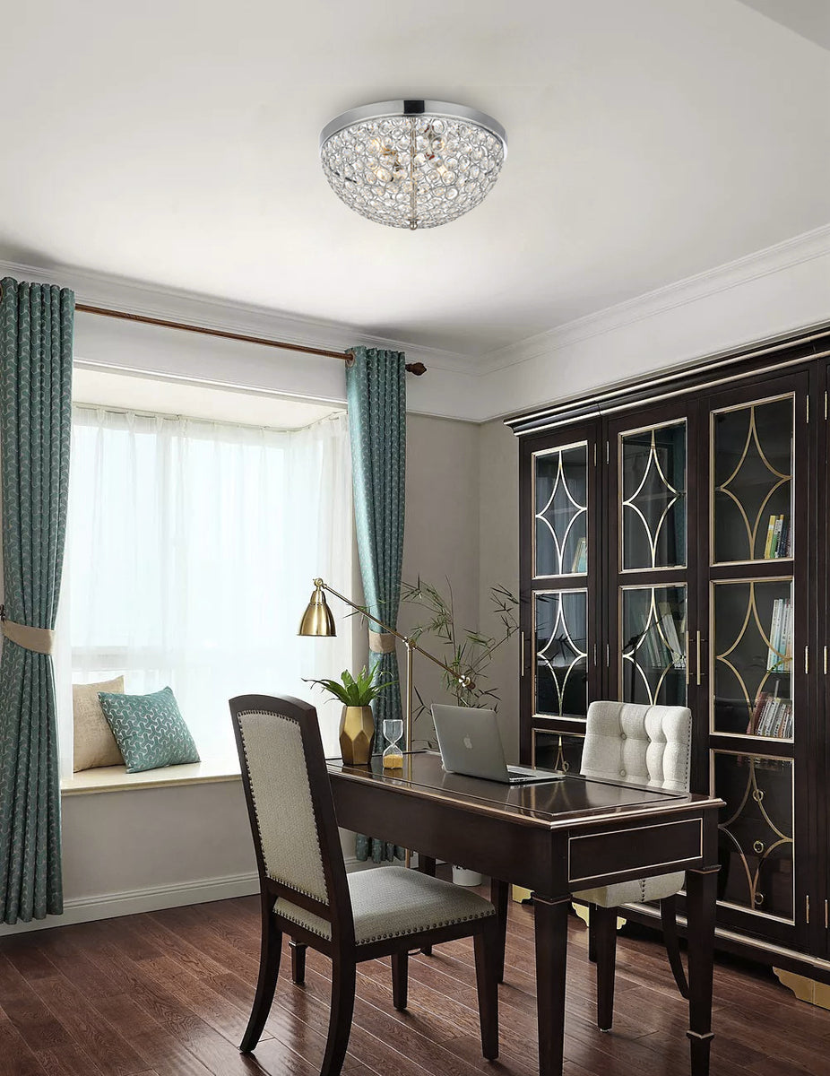 Taye collection flush mounts bring serious sparkle to a bedroom, bathroom or foyer with an intricate, yet understated design. A hemispherical cage-like frame features a central column and mounting plate in a bold Chrome finish. Suspended almost invisibly between the filigree-style wires, individual clear Crystal octagons shine. Light from hidden bulbs (Not included) is multiplied and refracted through the gorgeous Crystals, making this classic flush mount a brilliant choice.