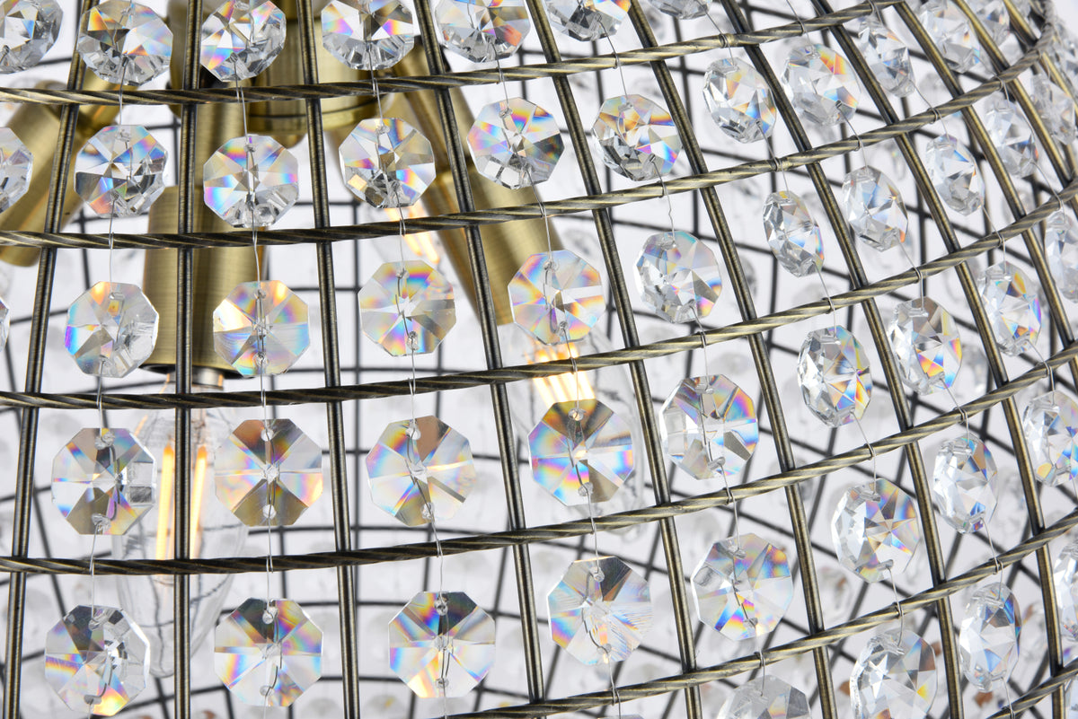 Brighten any room with this celestial globe of radiance, as overhead light bounces and dances off of hundreds of octagonal Crystal prisms. The beautiful spherical chandeliers of the Earlene collection are shaped by latitudinal and longitudinal metal ribs supporting the multifaceted ornaments, capped above and below with bases featuring delicate folds of antique bronze and a distinctive lower finial. The 20-inch-diameter fixture is brilliantly illuminated by four bulbs (not included).