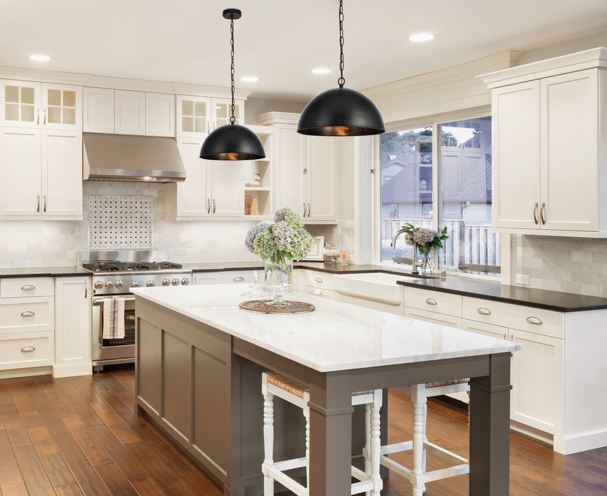 It’s often been said that “Less is more,” and the minimalist, utilitarian style of the Merce collection may be a perfect case in point. These delightfully simple pendant fixtures provide bold downward illumination from a Single, standard-sized bulb (not included) under a hemispherical metal shade suspended by a classic-looking matching chain. Available in handsome manual brass or vintage black, these back-to-basic fixtures can create a unique juxtaposition within many eclectic decorating styles.