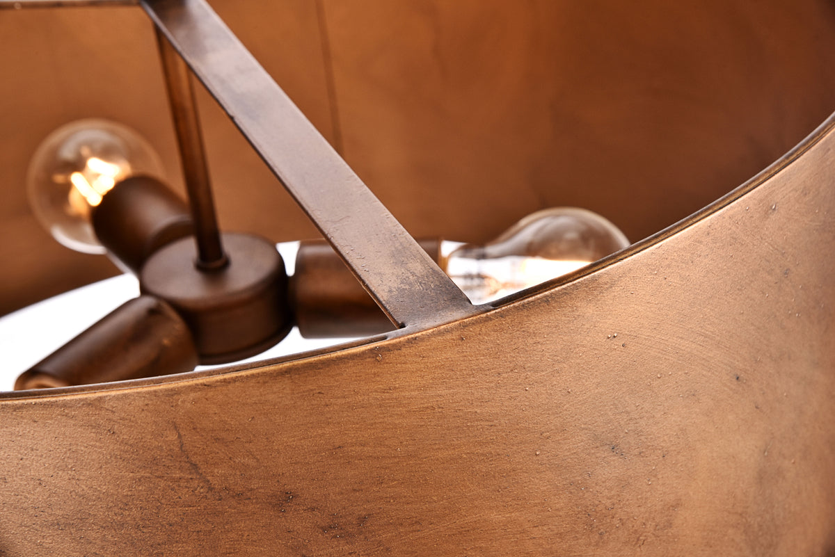 The raw power and audacious simplicity of Miro collection hanging fixtures will lend a commanding presence to your home – especially in a kitchen, living room, office, or studio space. The bold, textured cylindrical shade hangs from a rugged chain and disk-shaped mounting plate. Three exposed bulbs (Not included) hang from a hidden internal crosspiece and create a curious effect on the color of the interior. Available in a vintage-Black or manual-brass finish with two size options.