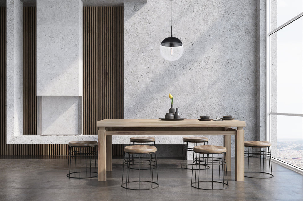 Refined style with a practical design, Eclipse hanging pendant lamps bring cosmopolitan sophistication anywhere, especially to an entryway, office, bathroom, bedroom, or kitchen. The smooth iron frame features a disk-shaped canopy and comes in a black finish. An adjustable black cord allows you to vary the hanging height from 19.5 to 69 inches. A touch of color on top of the clear spherical glass shade brings character to this classic style. Living in the big city has never been this easy.