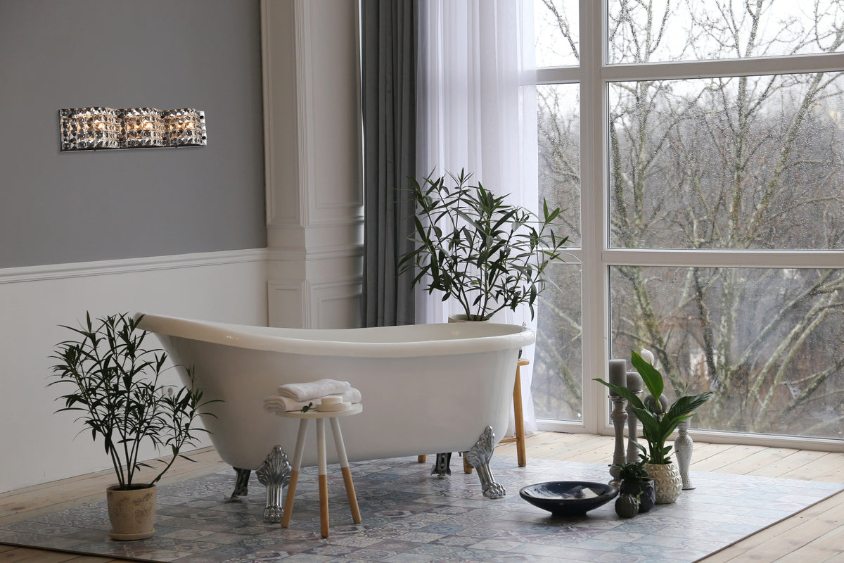 As beautiful as a gently rolling sea, Tate collection wall sconces brighten your walls with sumptuously sparkling waves. Three hidden bulbs (Not included) connect to a stainless-steel black-finished backplate and form three graceful ripples on the surface of this design. A stunning exterior is completely covered with glittering clear royal-cut square Crystals. The space between each square is subtly highlighted by a small stainless-steel flower-shaped accent, giving the overall look an additional level of intricacy. Guaranteed Not to rock the boat in a bathroom or bedroom