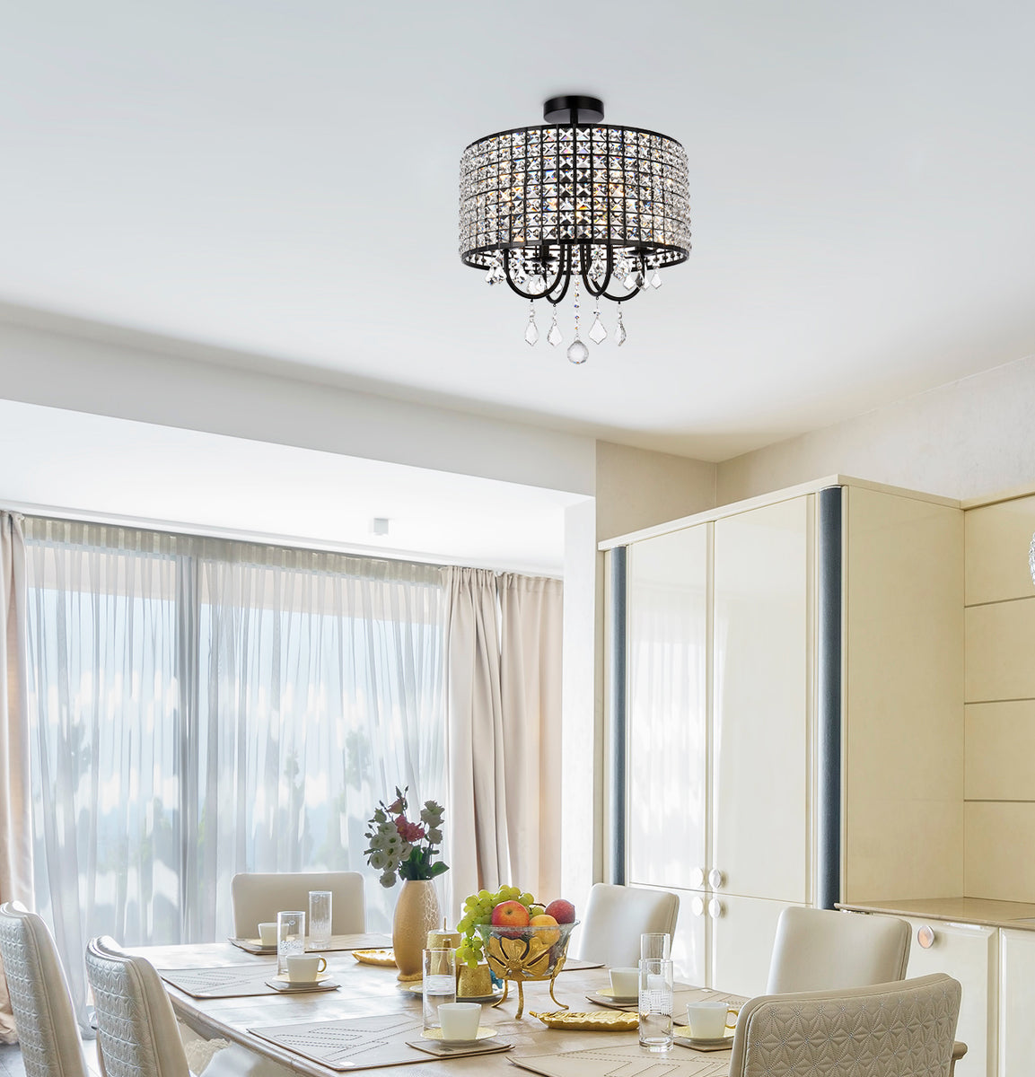 This 4 light semi-flush mount is sure to look great in your space. The circular canopy, small downrod, and sockets are made from metal of your choice of finish. It features a metal lattice shade that encases four sockets. This fixture takes four 40W bulbs, (not included) that wash your space in a bright glow. It's compatible with a dimmer switch, so you'll always have the right amount of light no matter the time of day.
