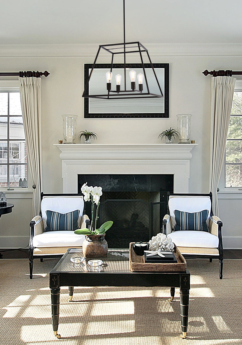 Sure to shine, this eye-catching lantern is crafted from iron, showcasing an open lantern silhouette that adds a dash of architectural appeal to the entryway, living room, or hall. Inside, four medium sockets hold 40 W maximum bulbs (not included). This hardwired design is also compatible with a dimmer switch, so you can set the mood as you please. Minimum hanging height of 21.4 inches and maximum hanging height of 61.4 inches. The overall height is adjustable, comes with one set of 6 inch rod, two sets of 12 inch rod, and one set of 16 inch rod.