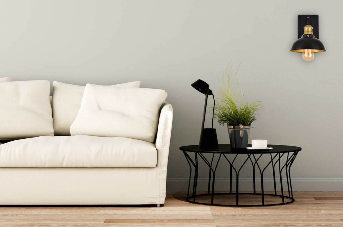 Create an industrial vintage look in your warehouse-inspired space with the striking Anders collection. The wall sconce features one to three Black bell-shaped shades with a Black and brass finish. A Metal arm connects one to three lights (Not included) to a sleek, Black Metal panel, providing a stunning contrast to the concentric brass detailing. This fixture will enhance the modern décor of your kitchen, bedroom, bathroom, study, or hallway.