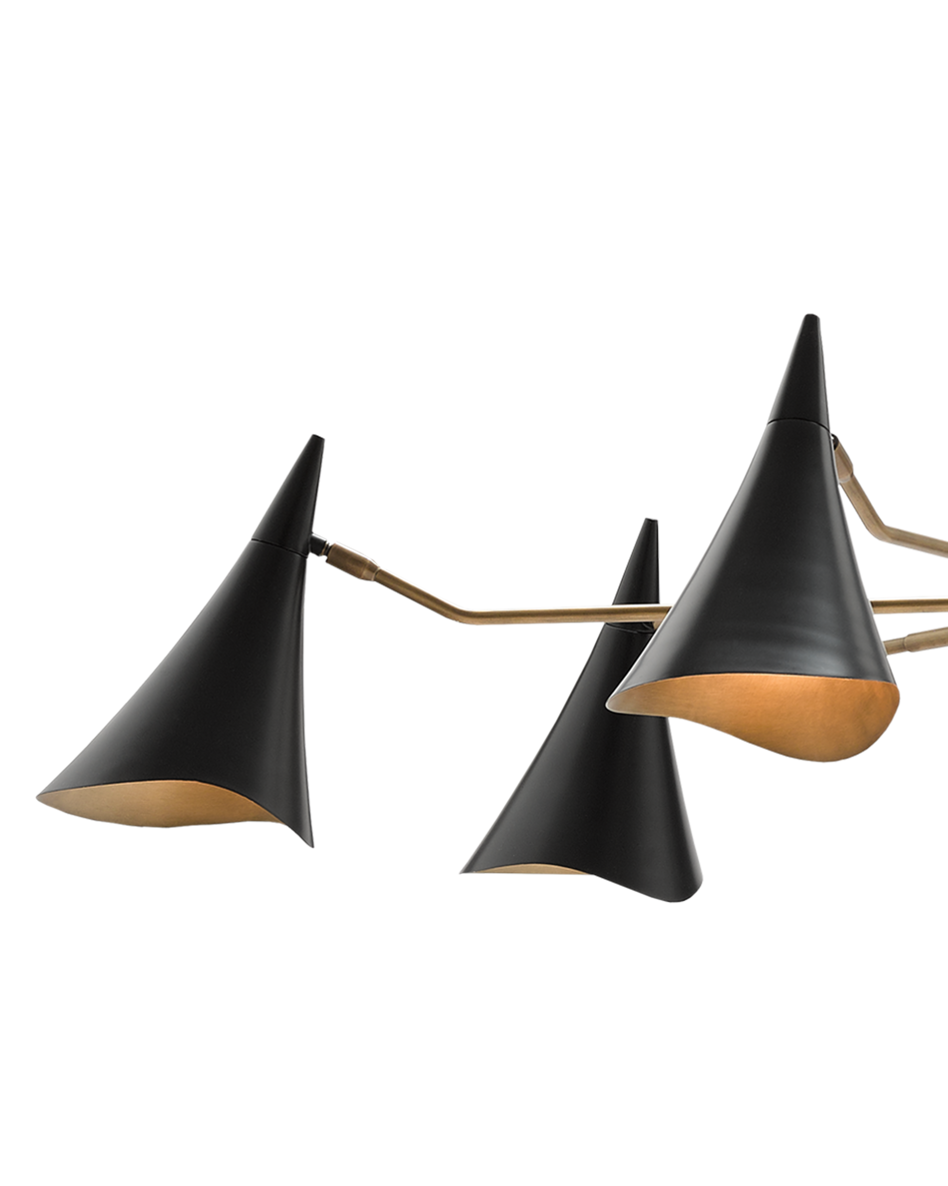 Our Library Chandelier has an organic style born in the mid-century modern era. The gleaming antique brass finish on the interior of the shades contrasts the oil-rubbed bronze on the exterior, which makes the black chandelier a handsome choice.