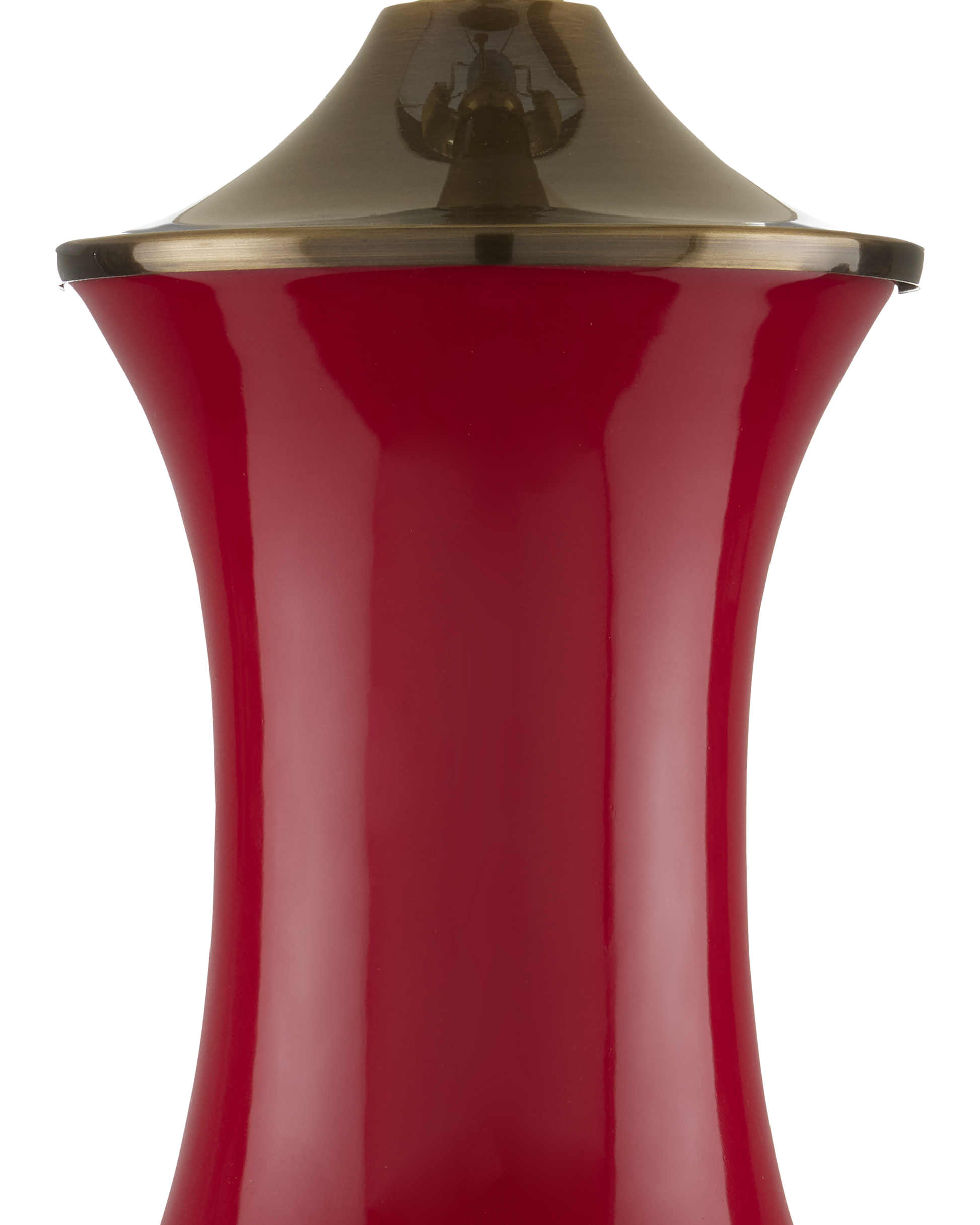Serenity has a profile in the Lilou Red Table Lamp with its lovely vase-like profile. Made of porcelain, the red surface has a luster to it for which this time-honored material is known. The depth of the red is luscious and warm, complemented by the metal hardware and base in an antique brass finish. A light element to the composition is the eggshell shantung drum shade, which is fastened in place with an antique brass finial. The Lilou is one of our most popular designs by Tom Caldwell.