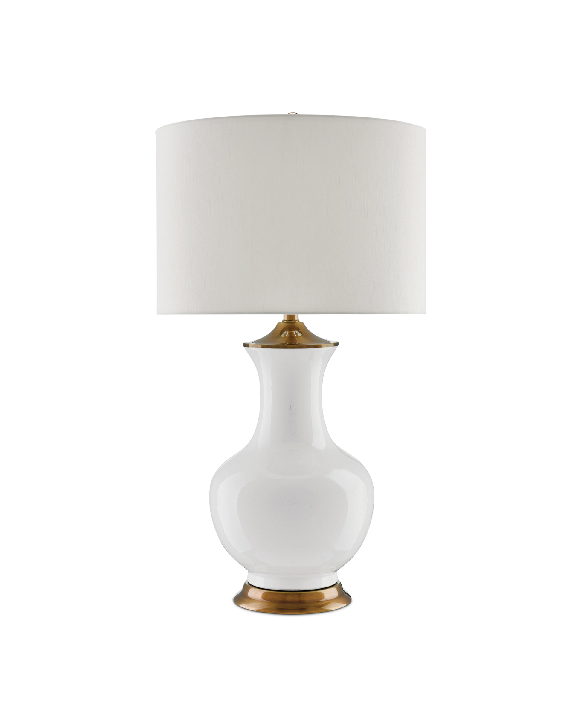Serenity has a profile in the Lilou White Table Lamp with its lovely vase-like shape. Made of white ceramic with metal hardware in an antique brass finish, the lamp is topped with an off-white shantung drum shade.