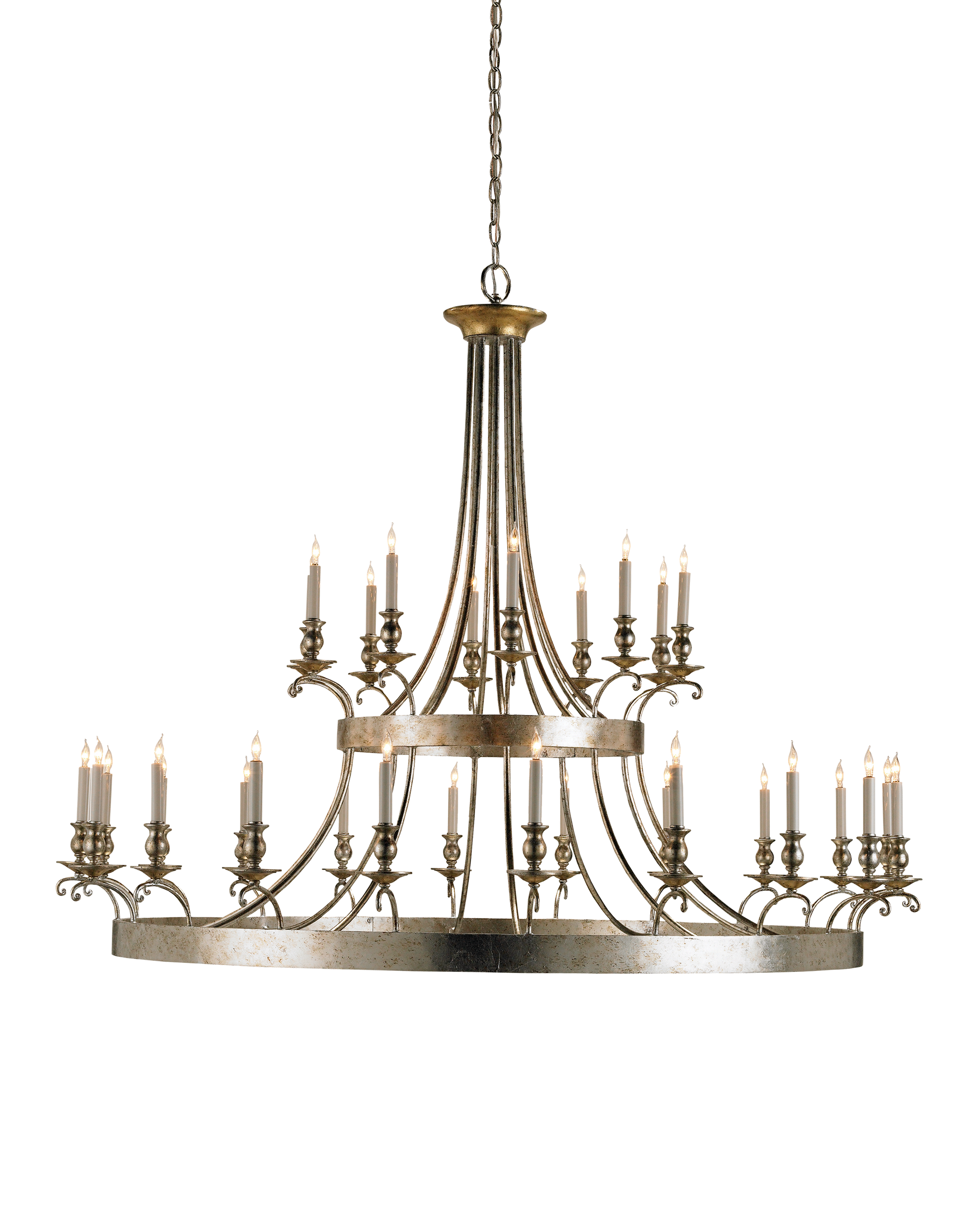 The Lodestar Chandelier is made of wrought iron in Granello silver leaf and antique gold leaf finishes. This grandly scaled, thirty-light silver chandelier has broad circular iron bands that support arching spokes. On these, elegantly detailed wooden bobeches are raised. The Lodestar is one of the traditional chandeliers in our offerings.