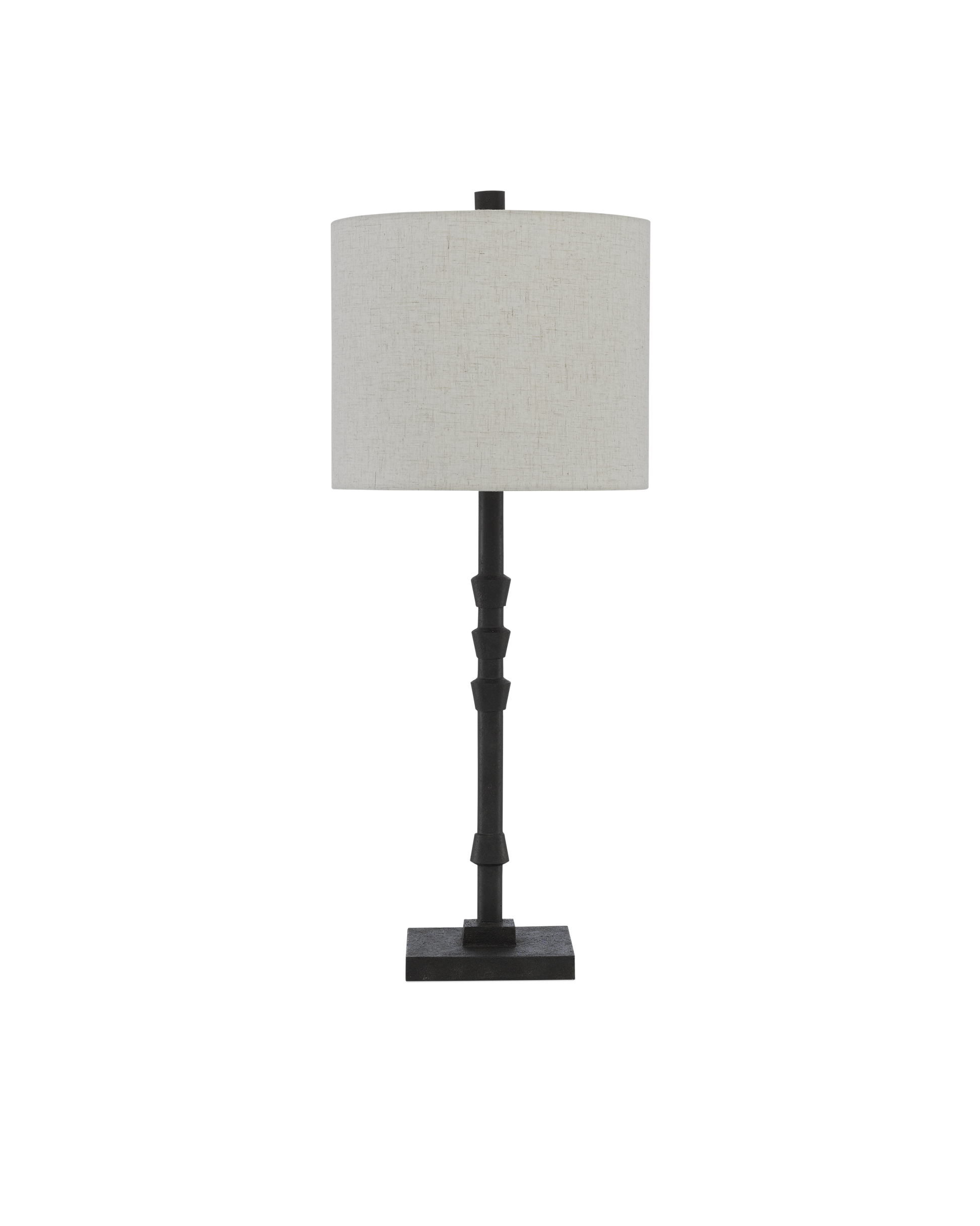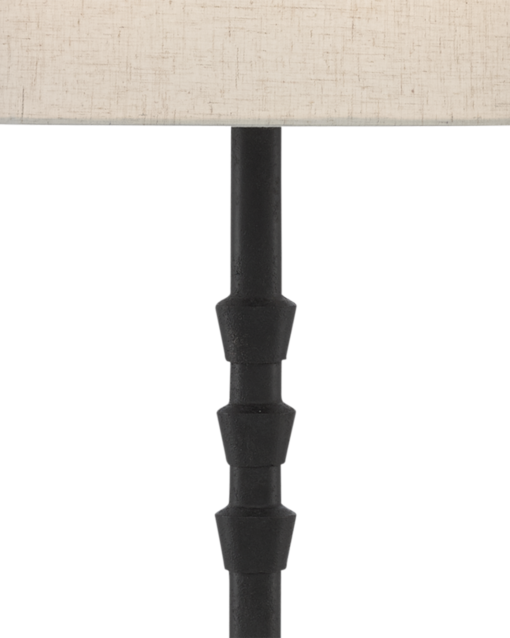 The Lohn Table Lamp has subtle ornamentations on its thin stem: up-turned fluted motifs point toward the beige poplin shade while a down-turned accent points toward the simple stacked base. These elements on the black table lamp are fashioned from cast-iron in a Mole black finish.