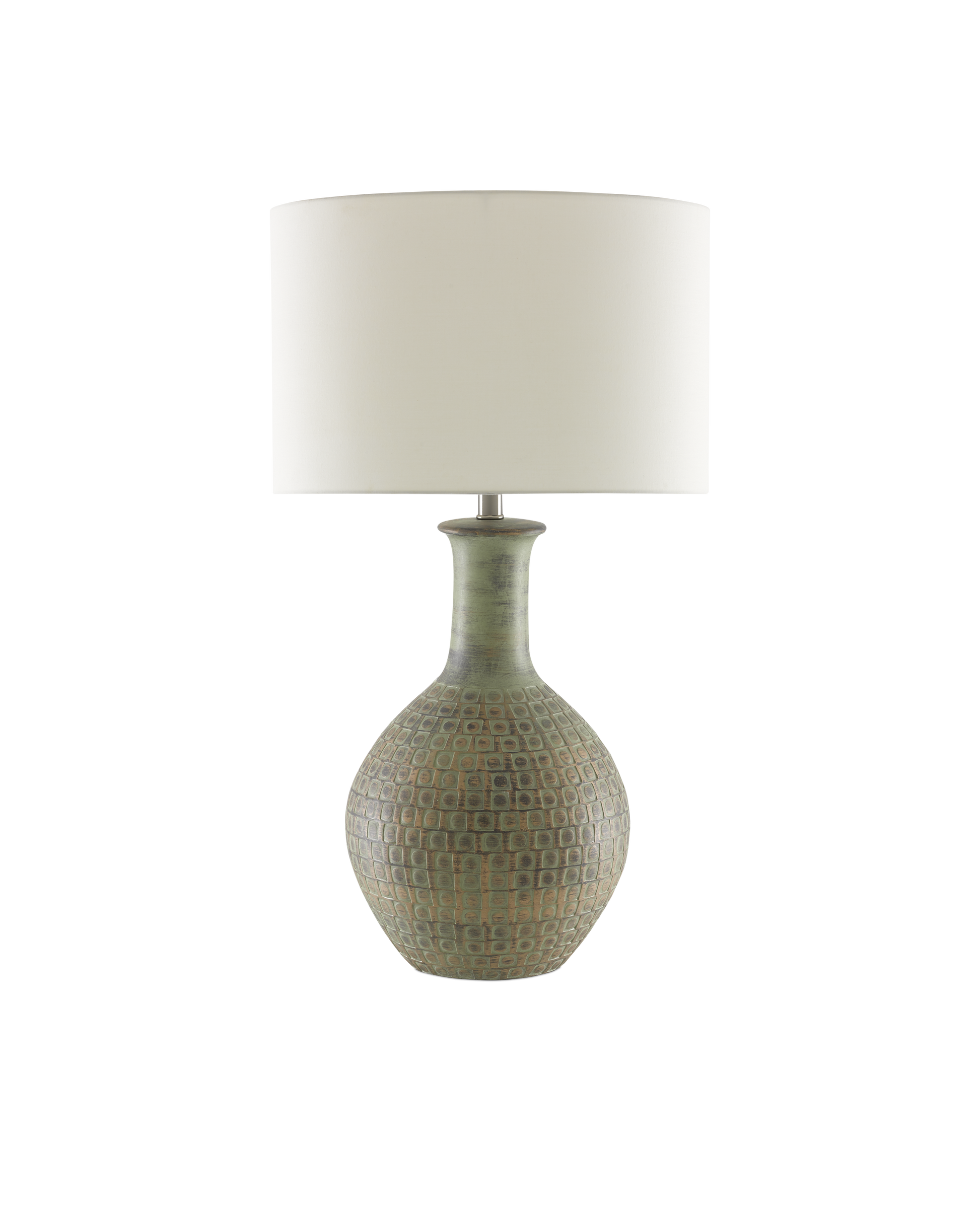 The Loro Table Lamp is made of terracotta with a distressed dark moss green and gold surface. Stamped into the body of the green lamp are artful squares to bring it a textural appeal. The Loro is topped with an ivory shantung shade.