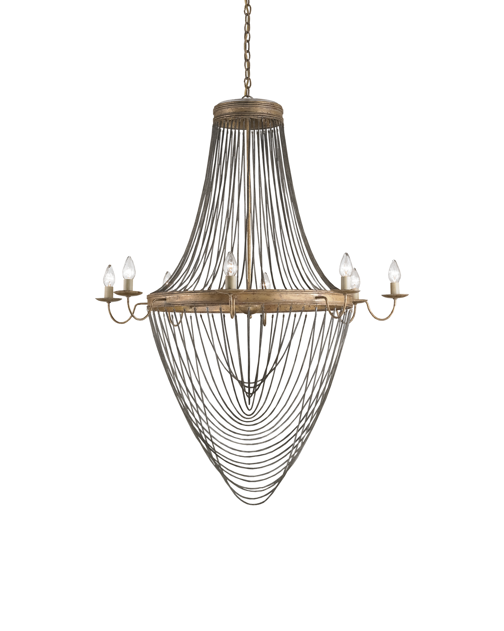 The dainty chains looping from point to point on the circular frames of the Lucien Chandelier are draped methodically and intentionally in a crisscross pattern. These bring this gold chandelier a sense of old world style, which is furthered by the French gold leaf finish on the frame.
