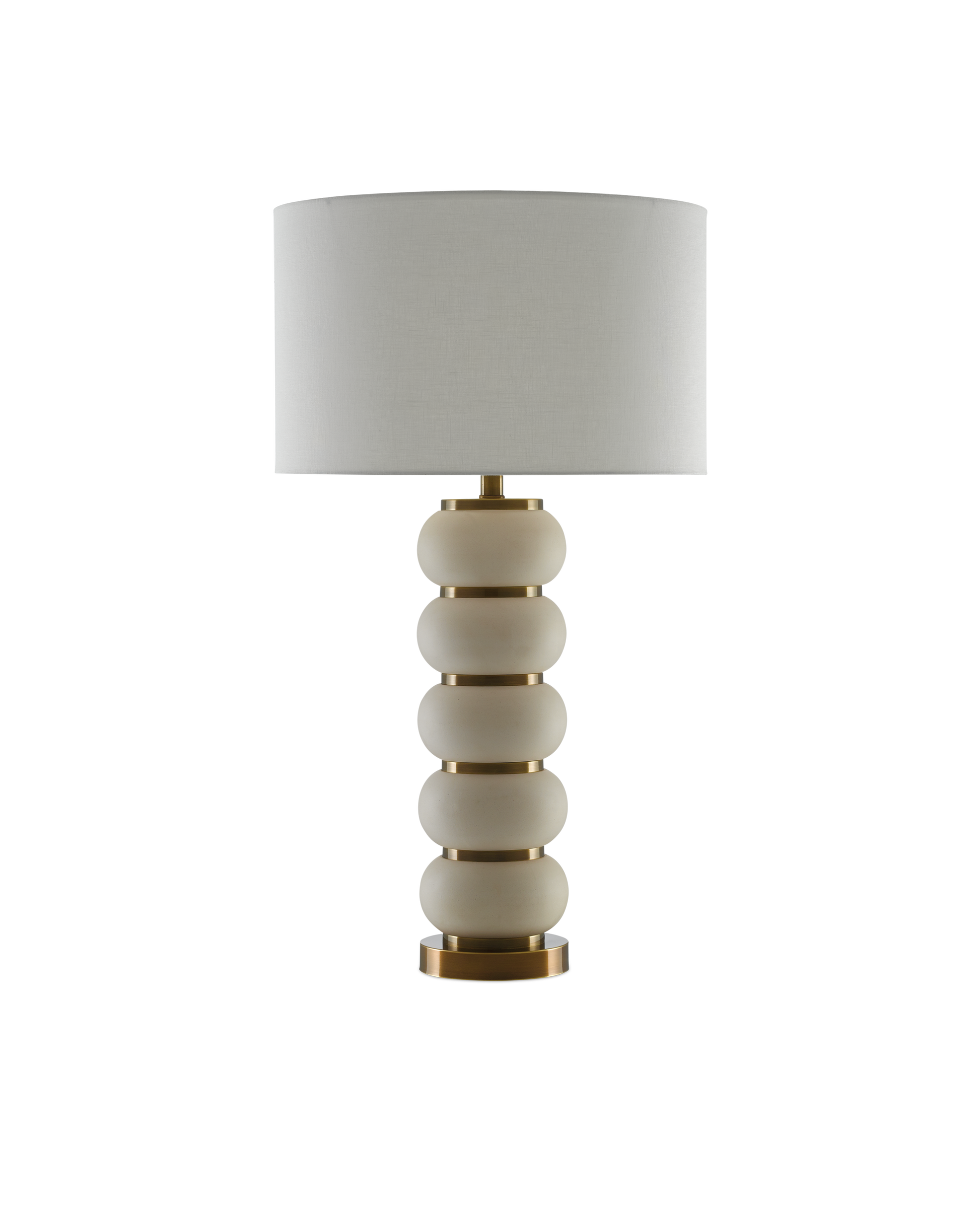 Our Luko Table Lamp is made of stacked quashed balls of ceramic in a white-mud finish interspersed with metal rings in an antique brass finish. These match the metal base and the hardware. Our Vica Table Lamp is the same design in a black-mud finish.