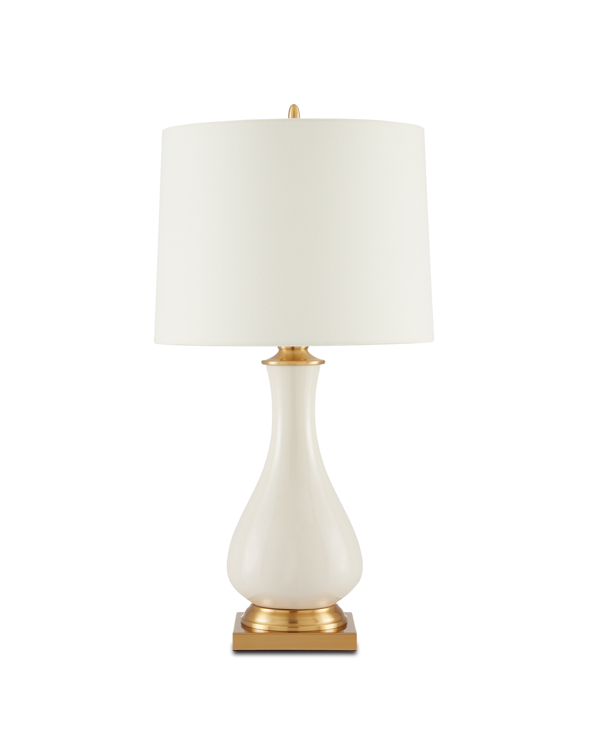 The Lynton Cream Table Lamp, a modernized version of a classically styled ceramic lamp, has a cream crackle finish. The warm glow of the brass mountings and coordinating finial contrast the body and the off-white linen shade.