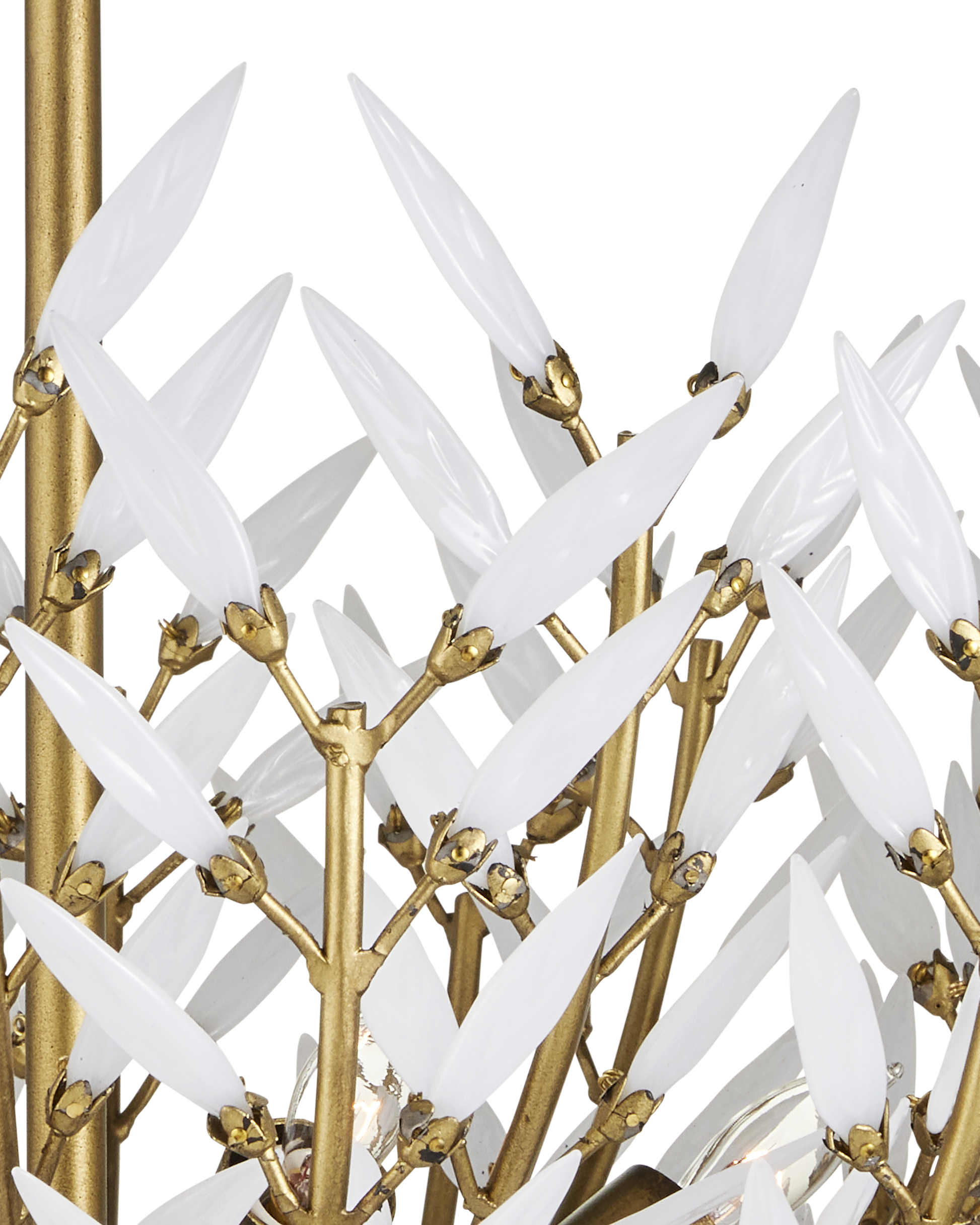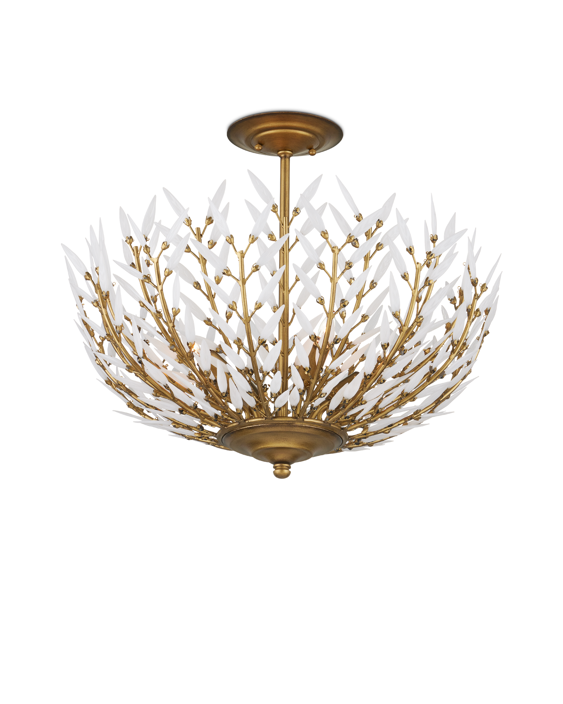 Undertaking the challenge of creating a clean-lined version of a vintage design, the Magnum Opus Semi-Flush Mount features rows of more than 300 glass leaves attached to the metal stems that effervesce when light strikes them to create a stunning sculptural fixture. The white glass also beautifully contrasts the metal in a brass finish, the cool/warm contrast bringing the gold semi-flush a heightened level of interest. The beautiful white glass leaves also surround the bulbs on this fixture to infuse a space with a lovely glow. Adjustable from 25.5" to 93.5" with use of included chain/rod kit/cable. If your space calls for a longer drop, additional chain/rods/cable is available for purchase.