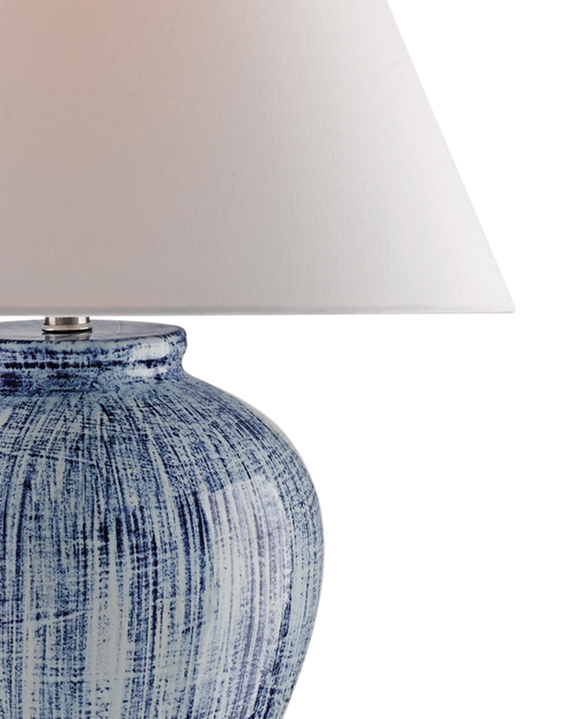 Like time-honored Dutch pottery, the Malaprop Table Lamp has a hand-glazed blue and white finish on its ceramic body. But this design has a modern edge given the brushstroke pattern is texturally abstract. The blue lamp with its clear acrylic finial and base is fitted with a crisp white linen shade.