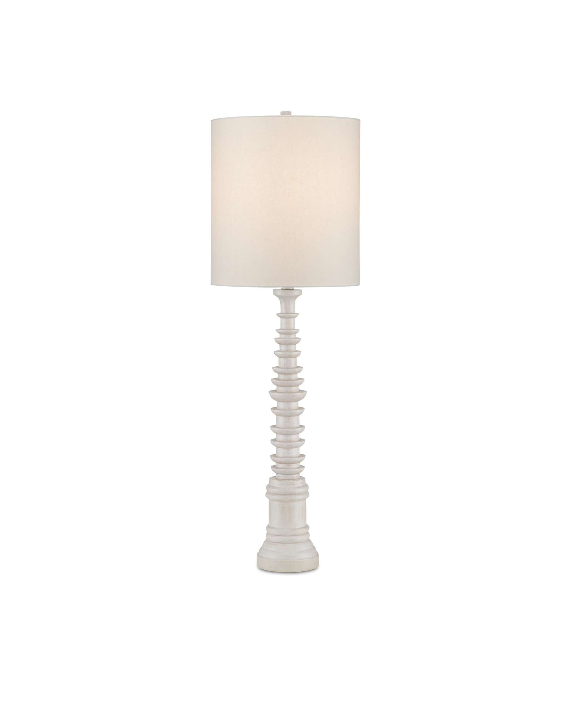 Rising like a temple spire, the Malayan White Table Lamp has the elemental flair that gives master woodworkers bragging rights. The fluted body is made of rubber wood in a whitewash finish. The tall, thin linen shade placed atop this composition from the Phyllis Morris Collection makes it all the more commanding. This would be the perfect lamp for a buffet or a console.