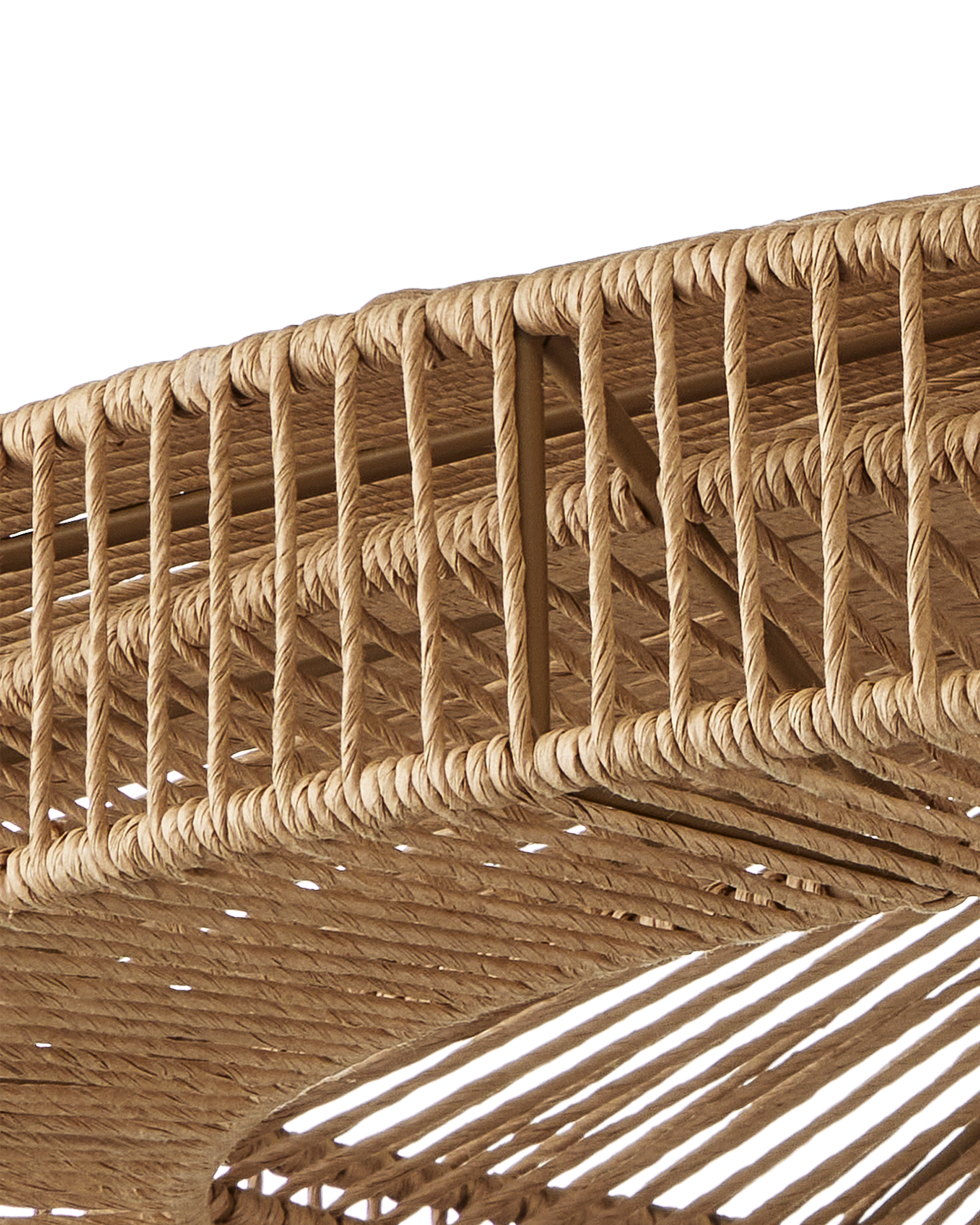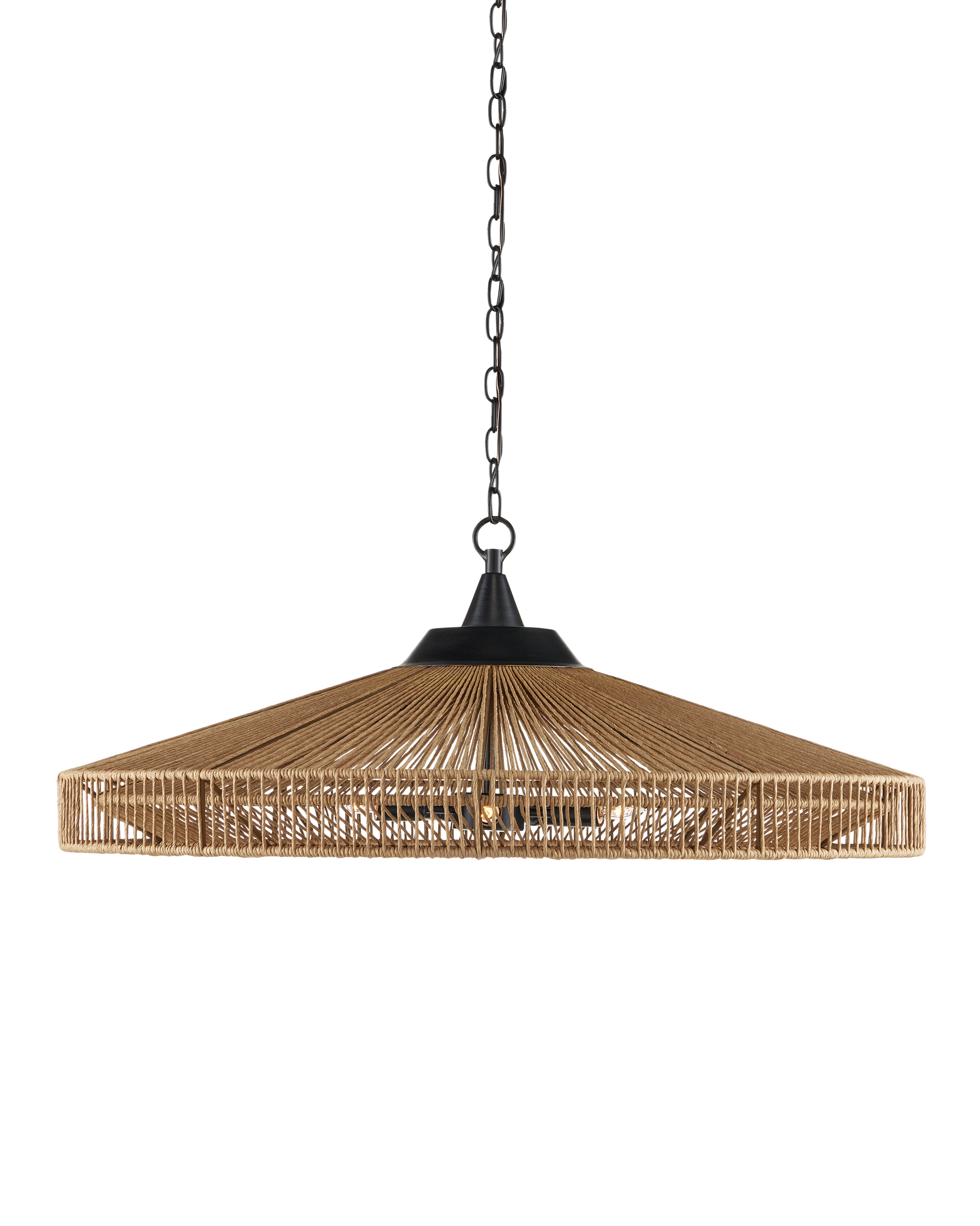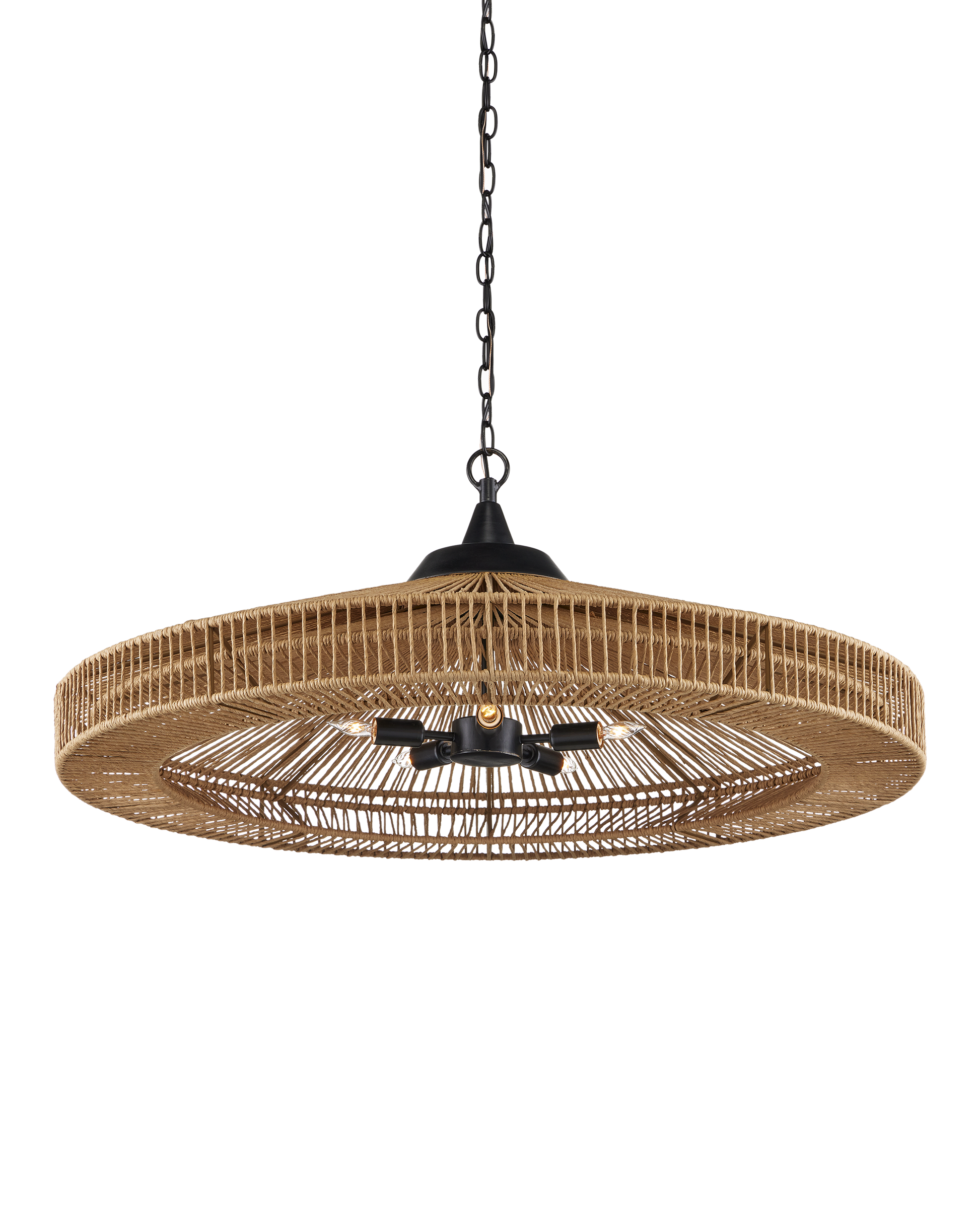 The Maldives Chandelier is made of wrought iron in a mix of satin black and khaki finishes to make this fixture a shoe-in for a black and natural style approach. The rope-like cage that surrounds it, made of Kraft paper twine, is woven to the frame in two layers, the one closest to the light source more concentrated to diffuse the light. The rope chandelier is fitted with five bulbs to make it a luminous fixture. Adjustable from 19" to 87" with use of included chain/rod kit/cable. If your space calls for a longer drop, additional chain/rods/cable is available for purchase.
