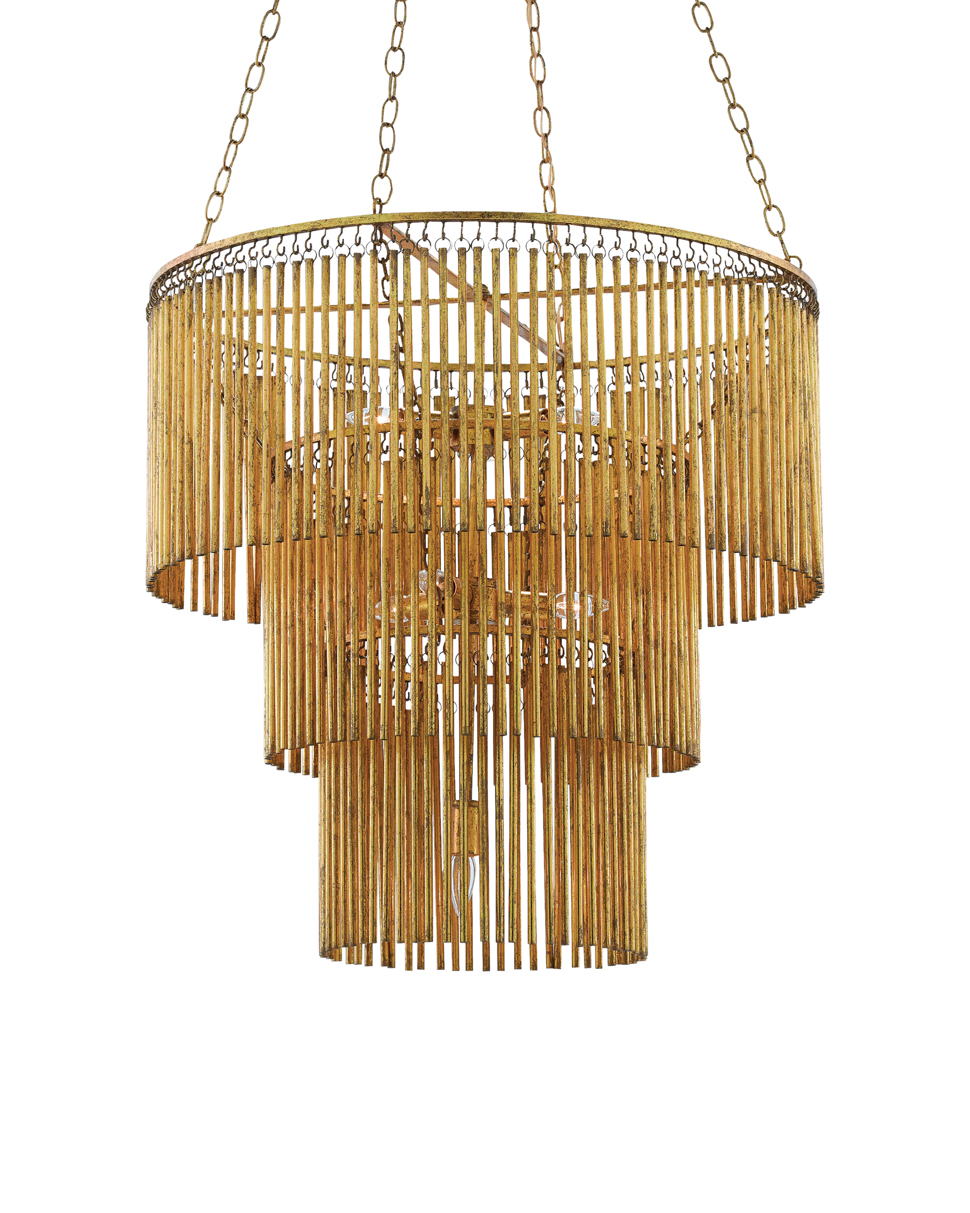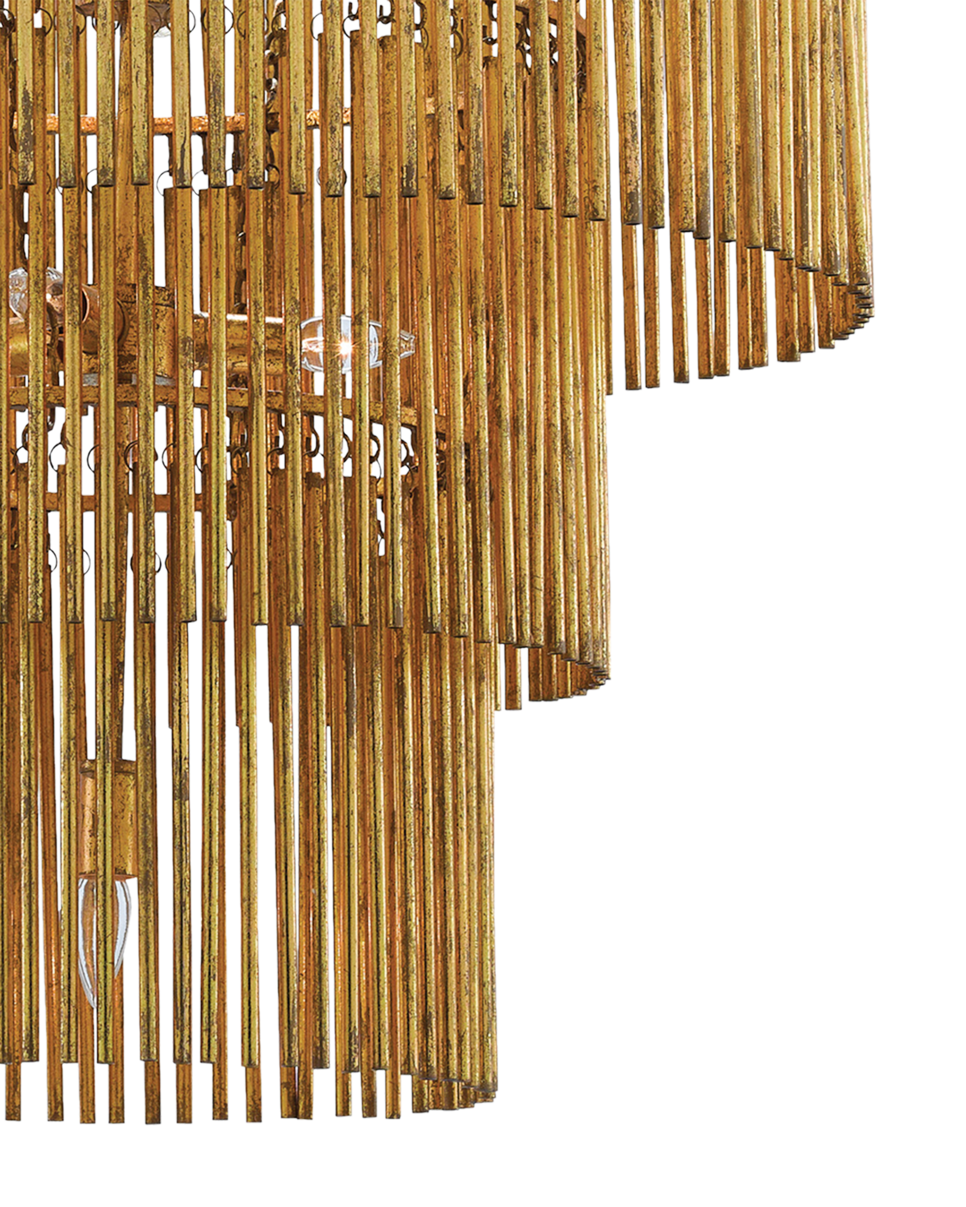 The Mantra Chandelier is an elegant example of mid-century modern luxe. The gold leaf finish on the long tentacles of metal that dangle from its three tiers bring the fixture a powerful punch of patina. This is due to the distressing our finish artisans achieved with this gold chandelier. Adjustable from 51.5" to 106" with use of included chain/rod kit/cable. If your space calls for a longer drop, additional chain/rods/cable is available for purchase.