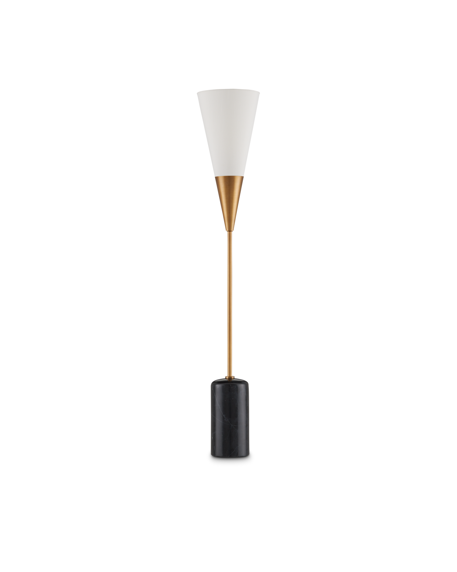 The Martini Black Torchiere Table Lamp was designed by Ian Thornton, whose inspiration was a martini glass that he stretched to form a narrower shape. He made the same move with the black marble base. The result is a chic gold and black table lamp with a cocktail of appealing attributes, including the antique brass finish on the metal and the off-white shantung shade that works in concert with the marble to lighten the composition.