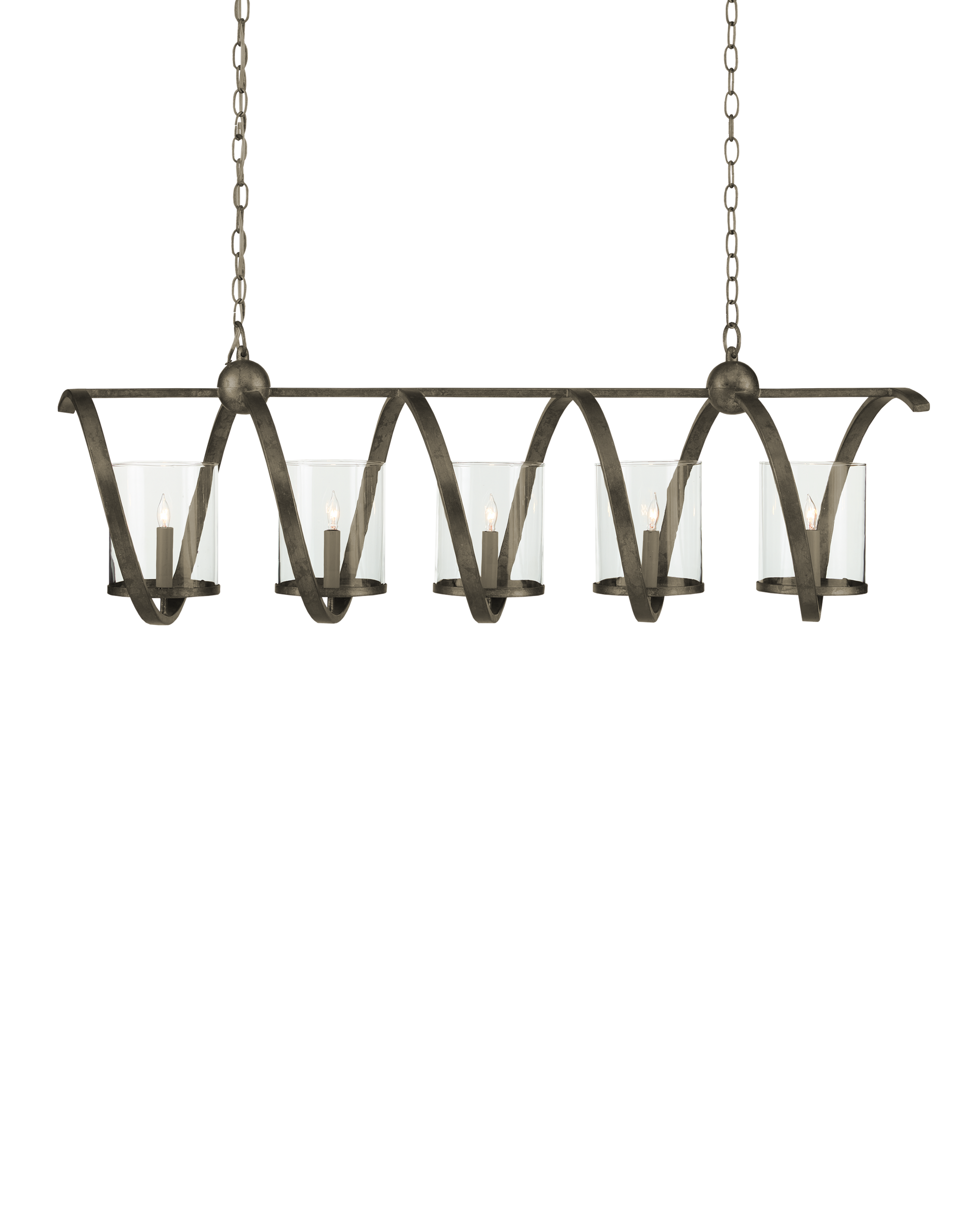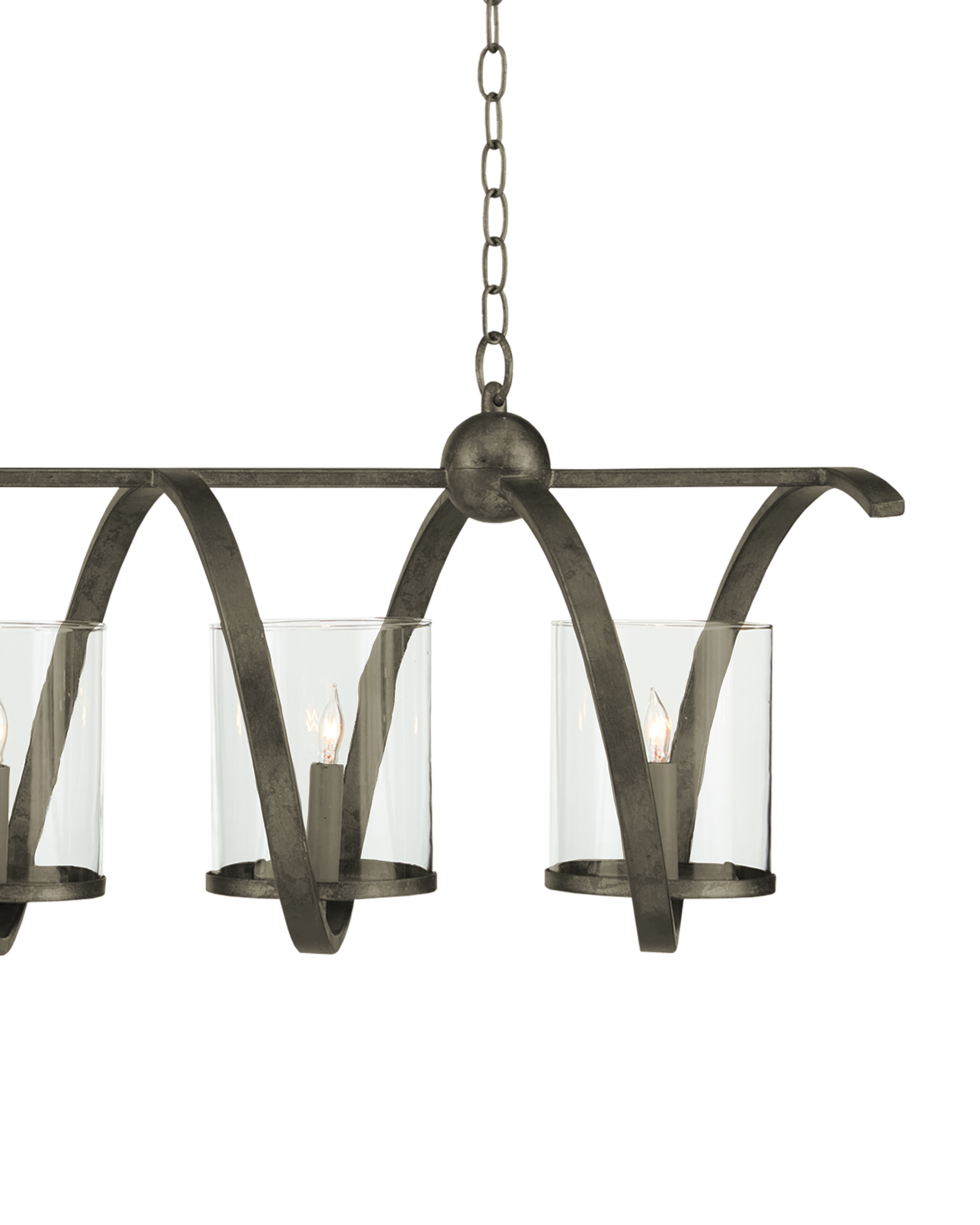 Our Maximus Bronze Chandelier has a fanciful design made of wrought iron spirals that hold beautiful glass shades. The metal on the fixture in a rich Pyrite bronze finish has been mottled for a slight textural feel. There are a number of fixtures in the Maximus family.