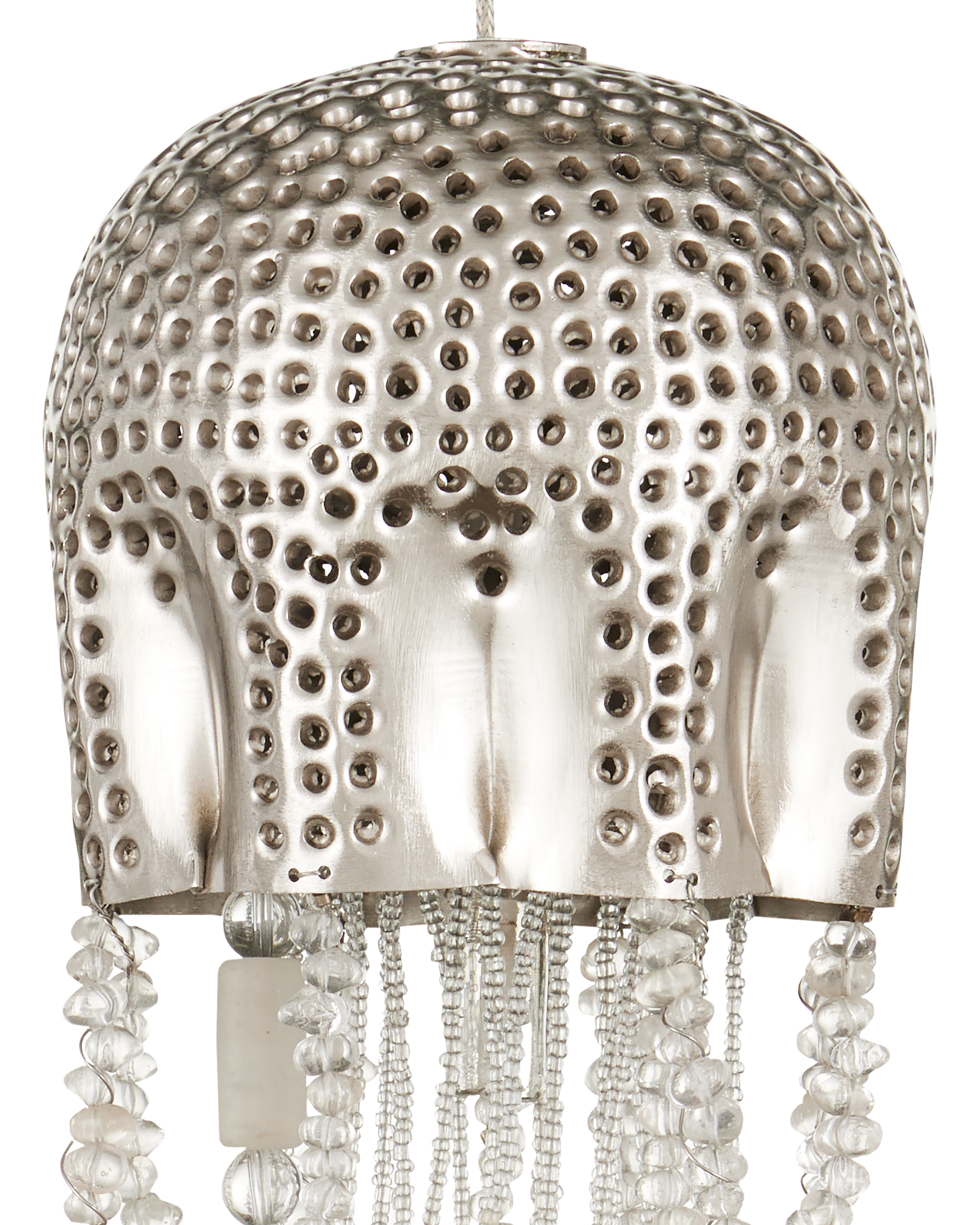 The Medusa 36-Light Multi-Drop Pendant effervesces with echoes of the deep sea. Beads cascading from its dimpled shades in a nickel finish mimic the profile of a jellyfish, one of nature's most mysterious creatures. The beads are threaded by hand and the cap is hand-punched, a mix of tasks that are painstakingly involved. These highlight the skills of the craftspeople who make our most artful products. The beads took on added paleness once they were sandblasted before being attached. The canopy of this piece is luminous in a painted silver finish. This fixture is among Currey & Company's multi-drop pendant collection, which includes multiple configurations.
