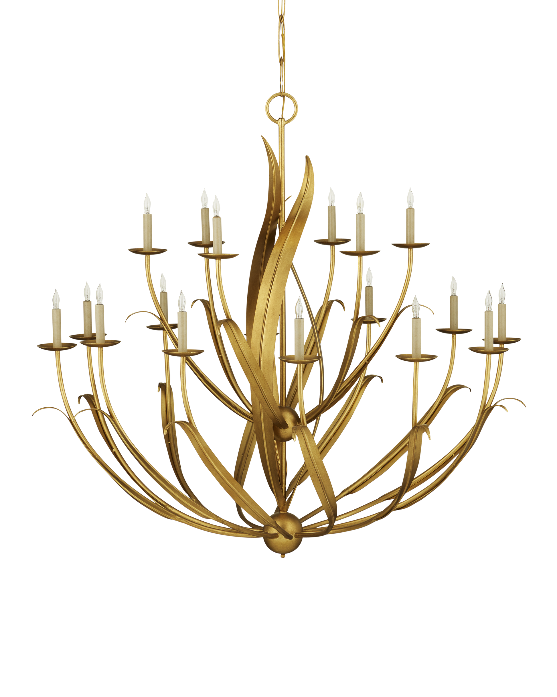 The swirl of long, slender leaves wave as if being stirred by summer breezes on the Menefee Large Gold Chandelier. The hand-applied antique gold leaf finish makes the wrought iron gleam on this transitional, nature-inspired form, whether the lights are switched on or not. This fixture is a statement piece at 50-inches in diameter, so it is perfect for statuesque foyers, open great rooms, or any room with high ceilings and/or expansive floor plans. Adjustable from 53.25" to 121.25" with use of included chain/rod kit/cable. If your space calls for a longer drop, additional chain/rods/cable is available for purchase.