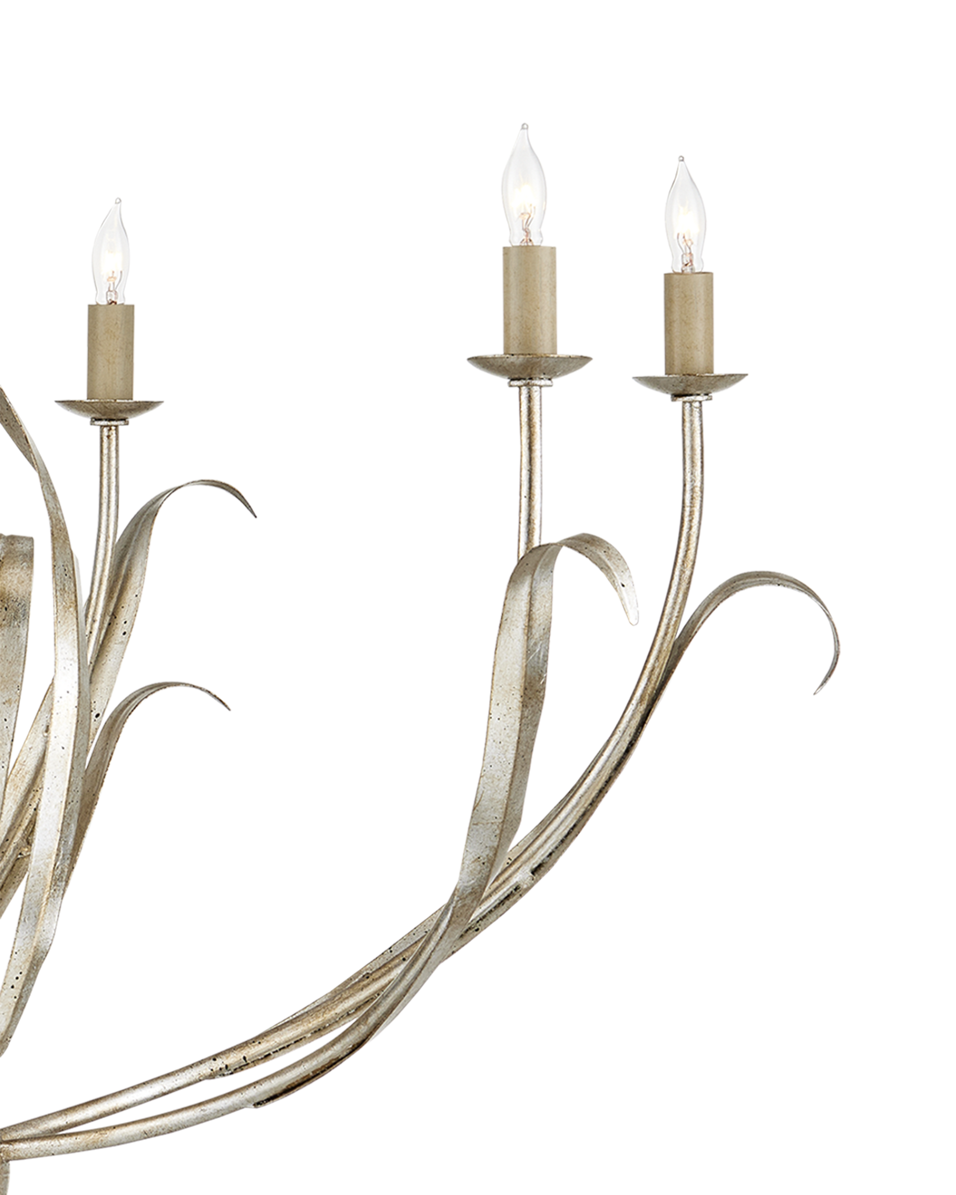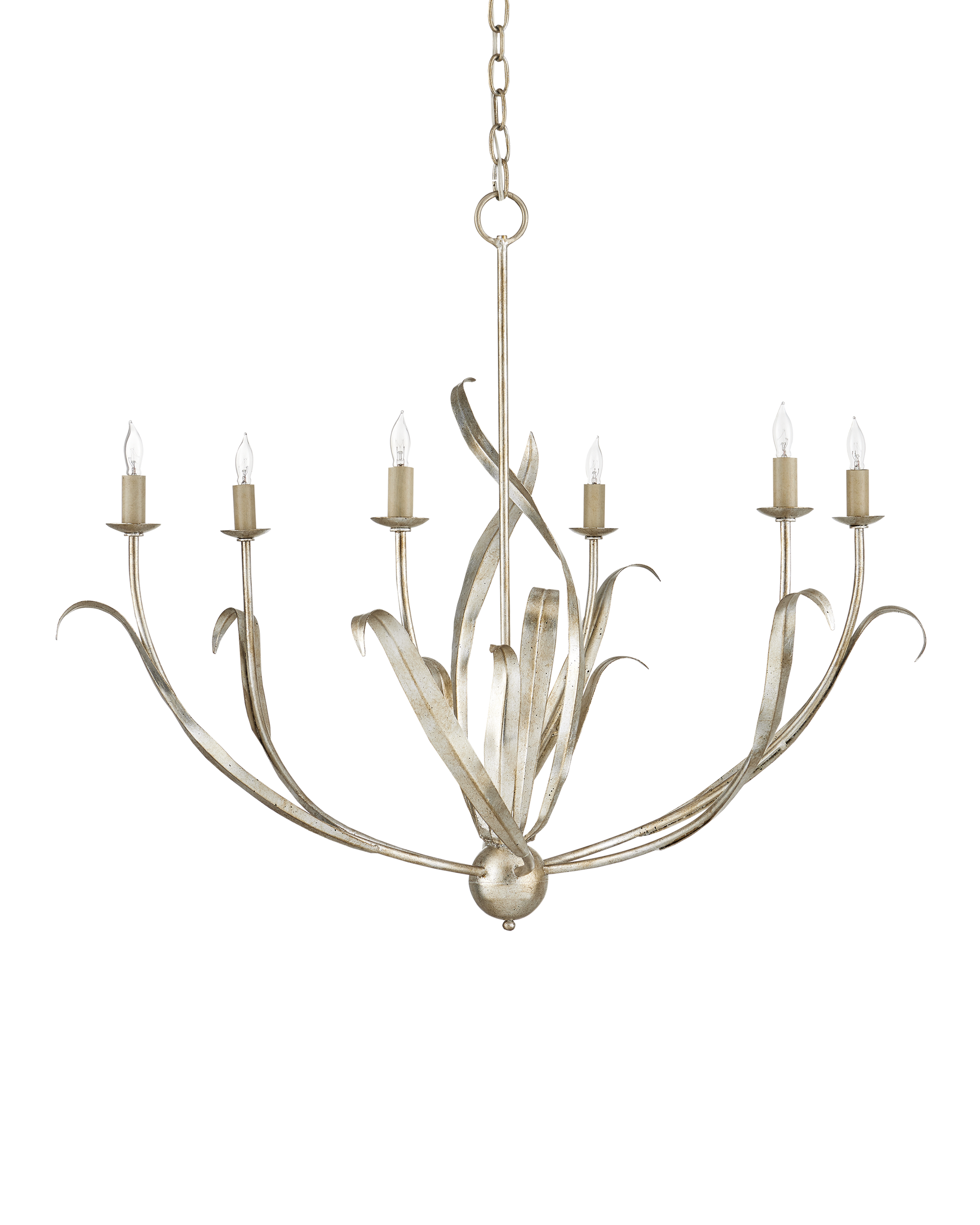 The swirl of long, slender leaves waving in a balmy summer breeze is called to mind when the lights of the Menefee Silver Chandelier are switched on. The hand-applied Silver Granello finish makes the wrought iron gleam on this transtional, nature-inspired form. Adjustable from 33" to 102" with use of included chain/rod kit/cable. If your space calls for a longer drop, additional chain/rods/cable is available for purchase.