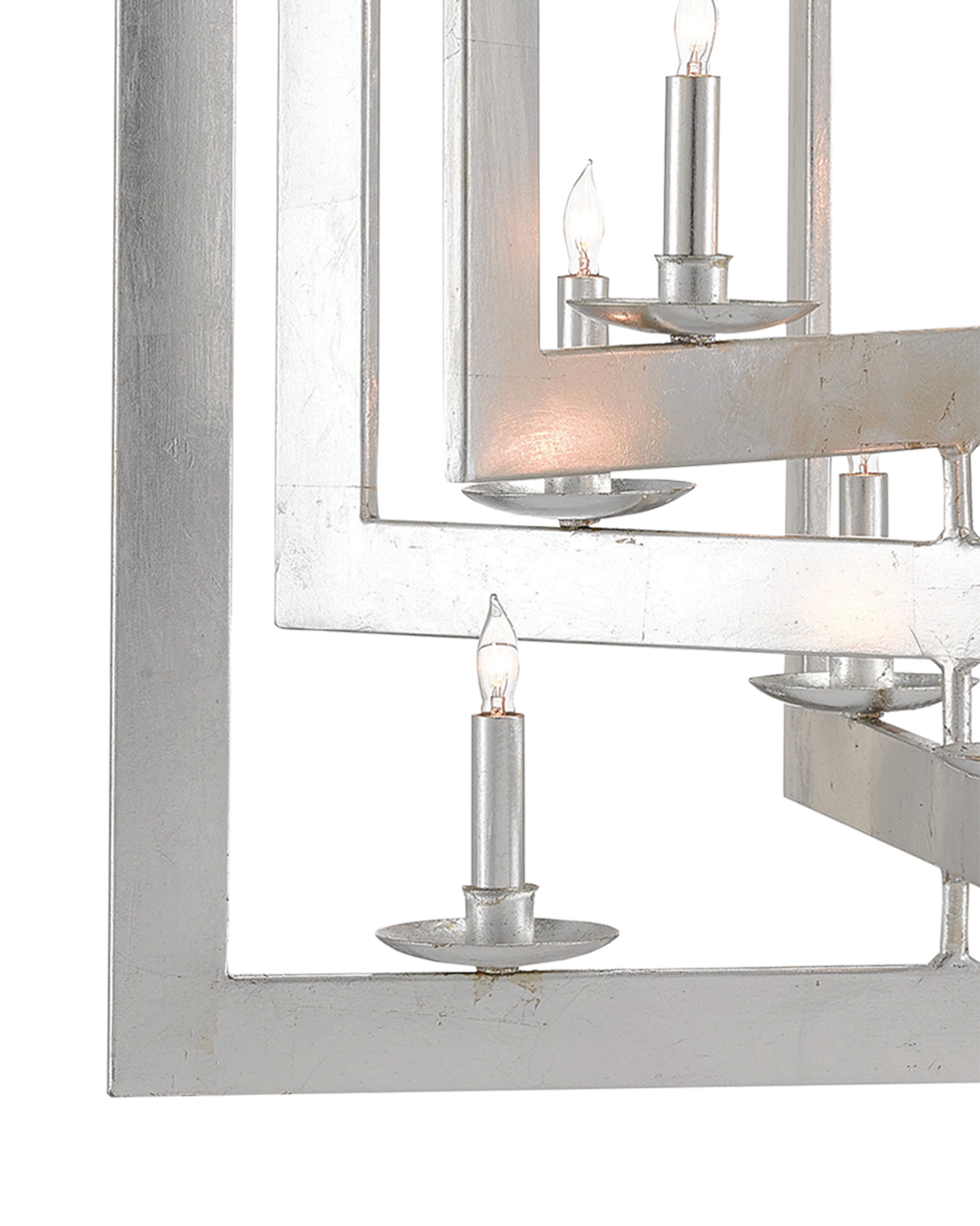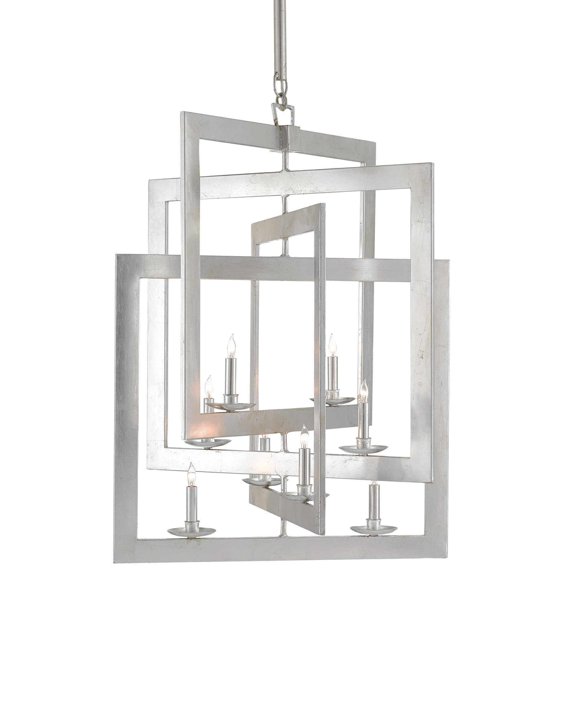 Our Middleton Silver Chandelier has interlocking squares created by wrought-iron bands that are smartly designed. The frame of this eight-light chandelier perfects the illusion of diminishing perspective, its contemporary silver leaf finish making it gleam. Adjustable from 56" to 115" with use of included chain/rod kit/cable. If your space calls for a longer drop, additional chain/rods/cable is available for purchase.